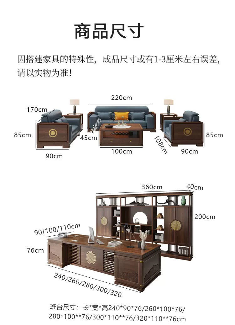 サイズ 2m オフィスのデスク,2.2m オフィスのデスク,2.4m オフィスのデスク,2.6m オフィスのデスク,2.8m オフィスのデスク,3m オフィスのデスク,3.2 オフィスデスク,メインチェア,ゲストチェア,シングルキャビネットドア本棚,サイドキャビネット,中央の本棚,シングルソファ,ダブルソファ,3人掛けソファ,ティーテーブル,コーナーテーブル