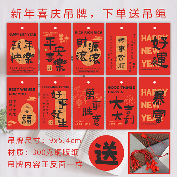 新款新年快乐吊牌喜庆红色乔迁卡片平安喜乐盆栽挂饰大吉大利吊卡