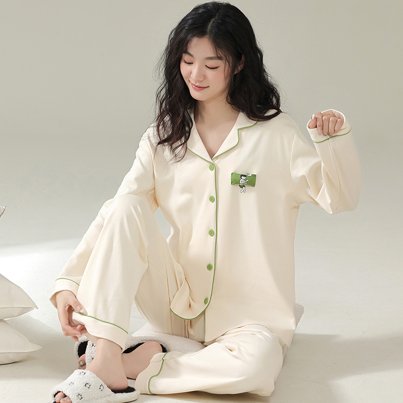 パジャマレディース春秋夏長袖長ズボン折り襟カーディガン甘美綿質カジュアル可外着ホームウェアセット