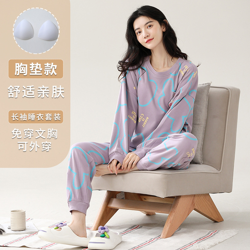 春秋季带胸垫棉质睡衣女胖mm200斤圆领家居服外穿加大码套装秋冬