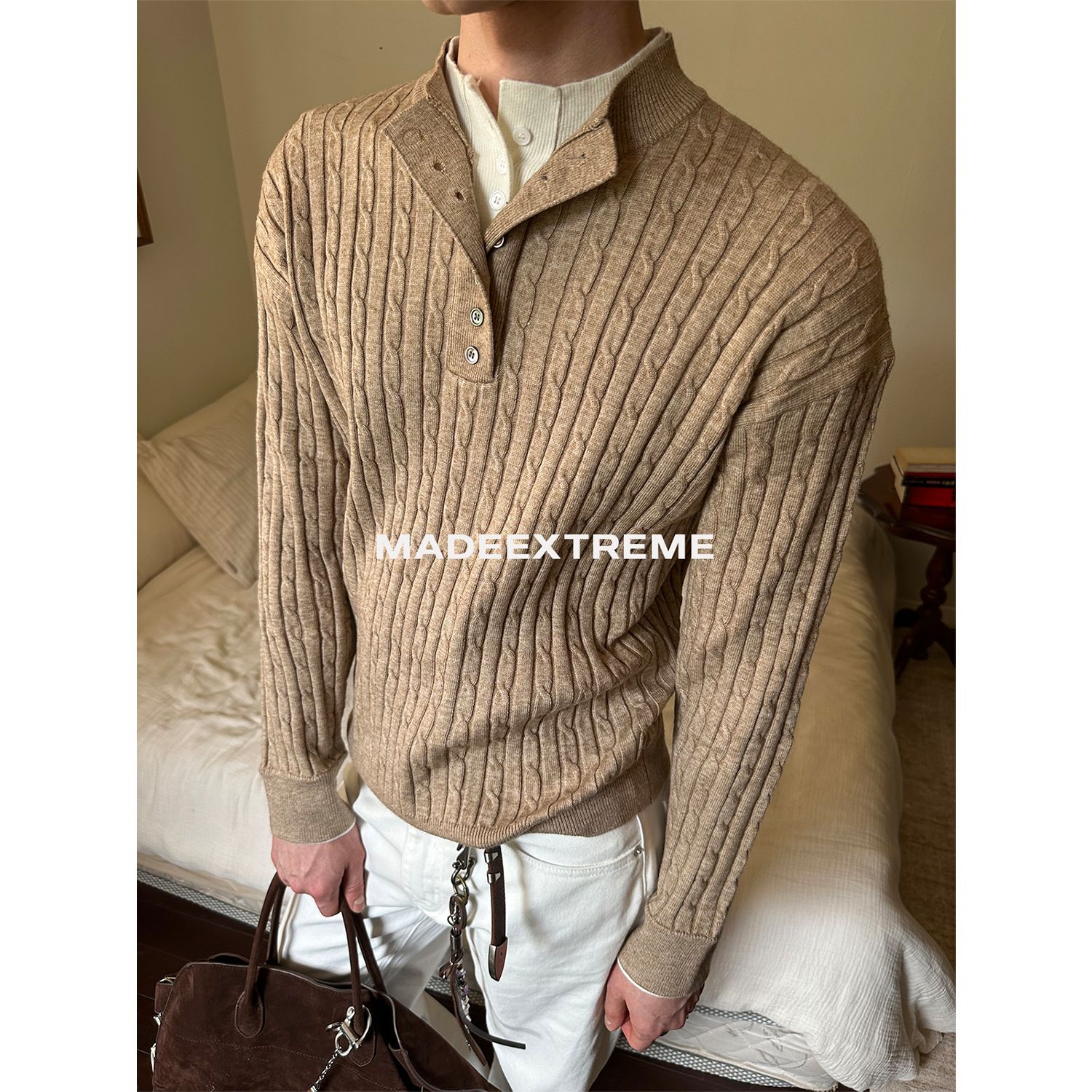 【EME】秋冬松弛感假两件双层亨利领麻花粗条纹针织衫毛衣男女