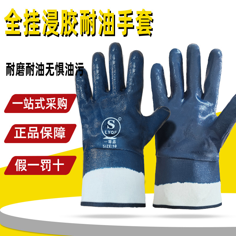 蓝大口丁腈手套防水浸胶耐油手套丁腈防油防滑耐磨全挂胶劳保手套