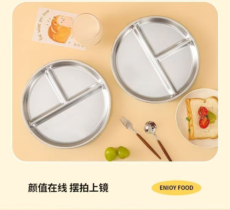 跨境不锈钢分格餐盘定量三格圆盘大人减脂餐盘学生定量比例分餐盘