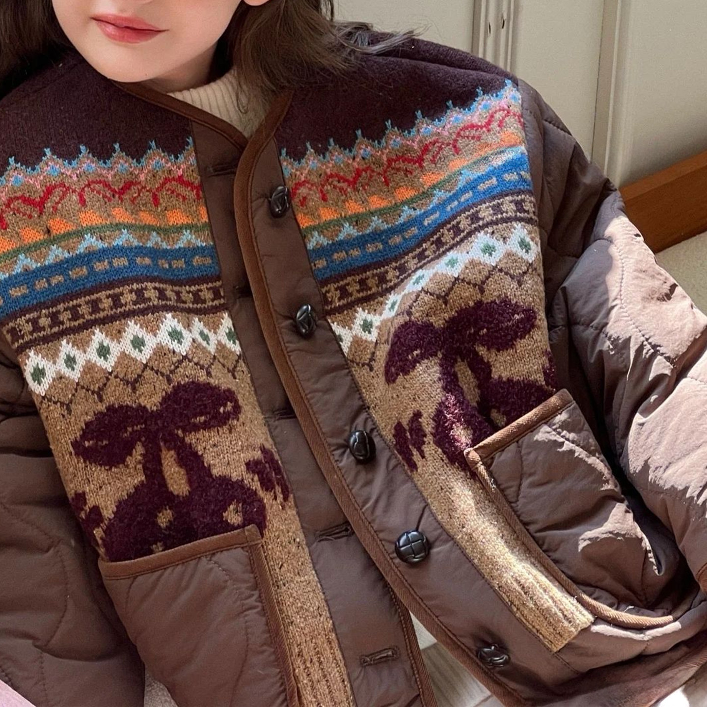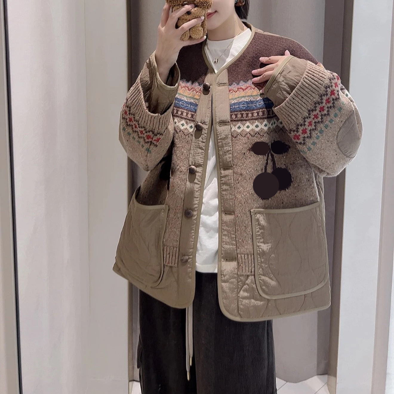 现货 棉衣外套2025冬季新款两面穿樱桃费尔岛棉服毛呢外套女Y1898