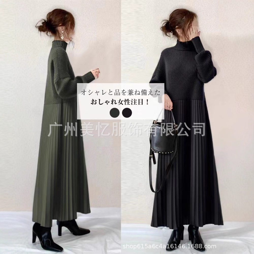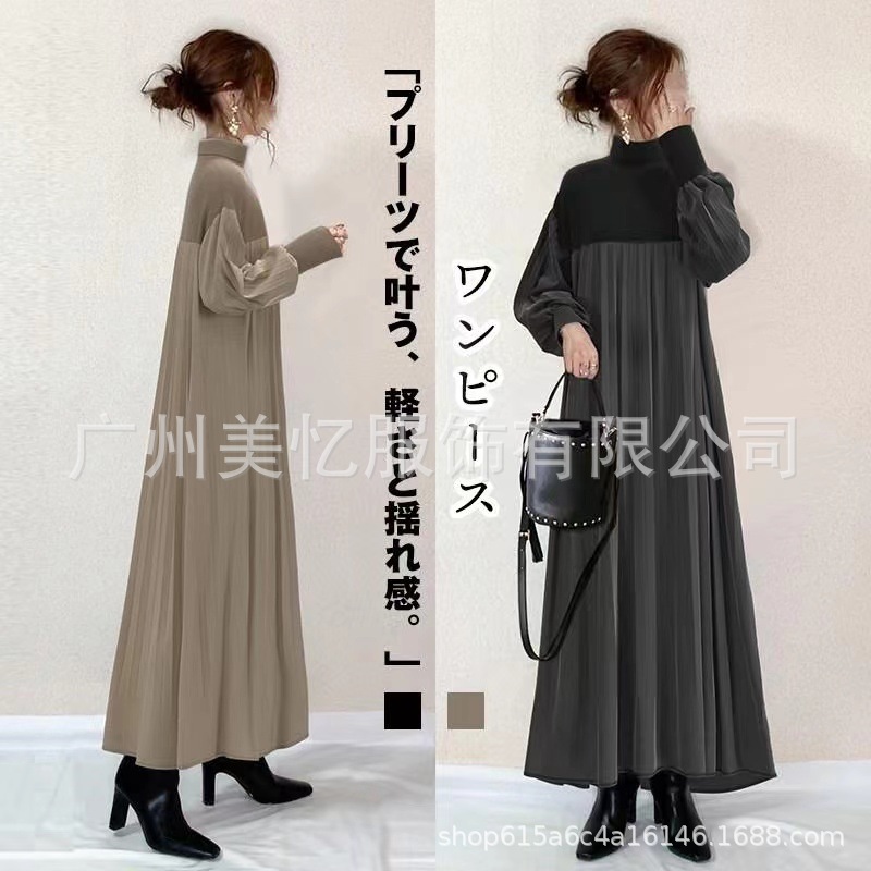 2025秋冬新作、ハイネックセーターとアコーディオンプリーツを組み合わせたゆったりロングワンピース、好評発売中