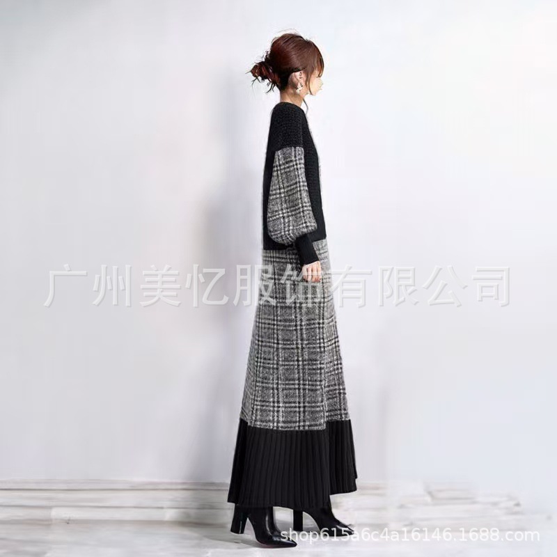 现货2025秋季热卖新款长裙高领毛织拼色风琴褶皱长款连衣裙
