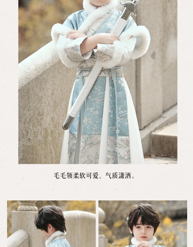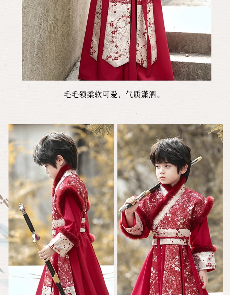 男の子用漢服正月服2025年新作中国風唐装秋冬裏起毛古装侠客子供用赤色演出服