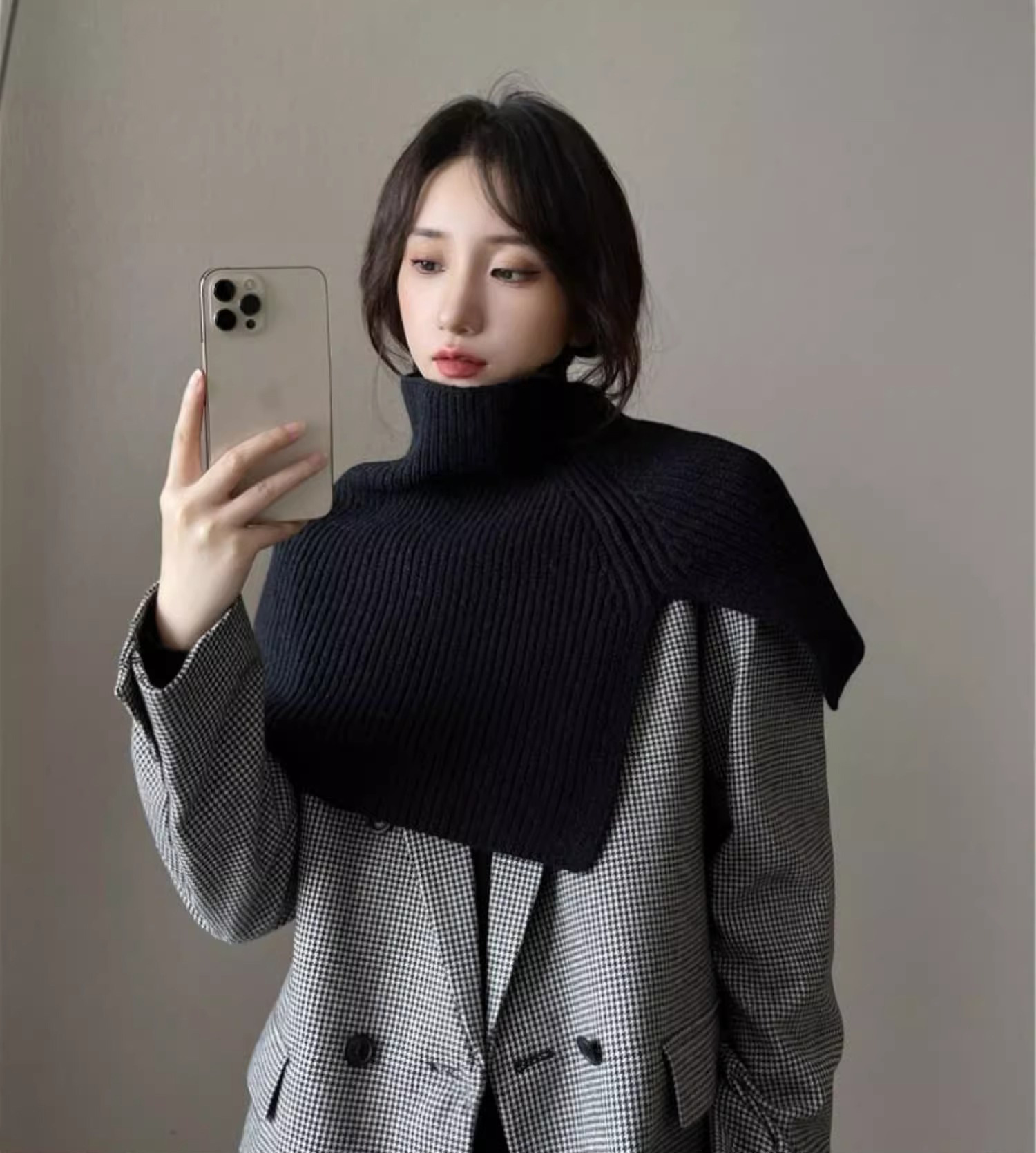 ストールの女性は秋冬の外に保温カバーをつけて首を囲みます。