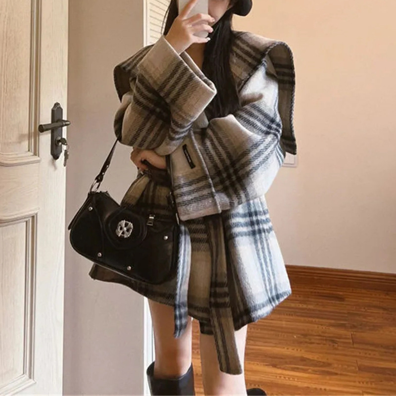 法式复古小香风格纹毛呢外套女秋冬季廓形收腰加厚呢子斗篷大衣潮