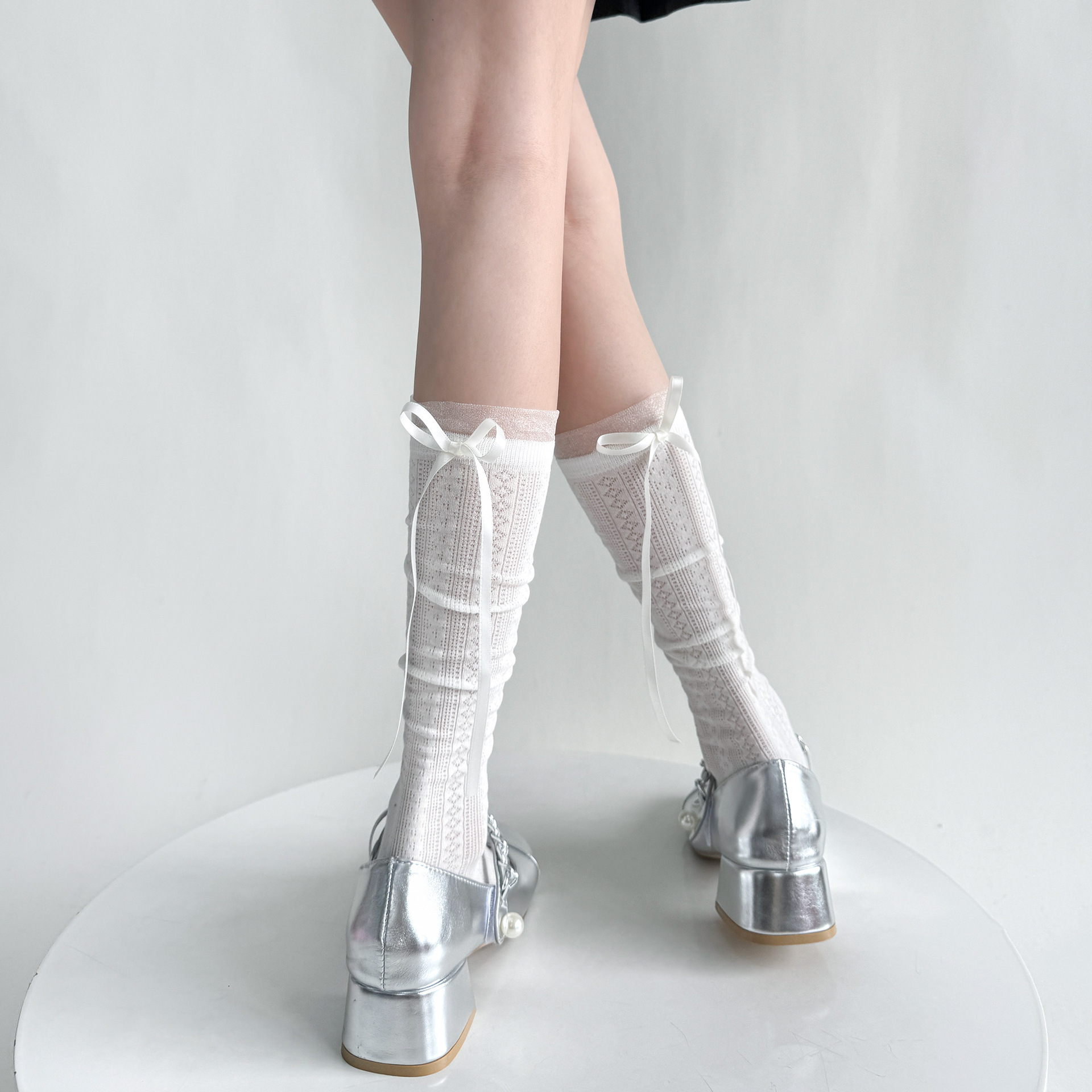 夏の薄いタイプの日本の透かし彫りの通気性の網の目の山のすねの靴下の純色の百合のかかとのリボンの乳の白い中筒の靴下