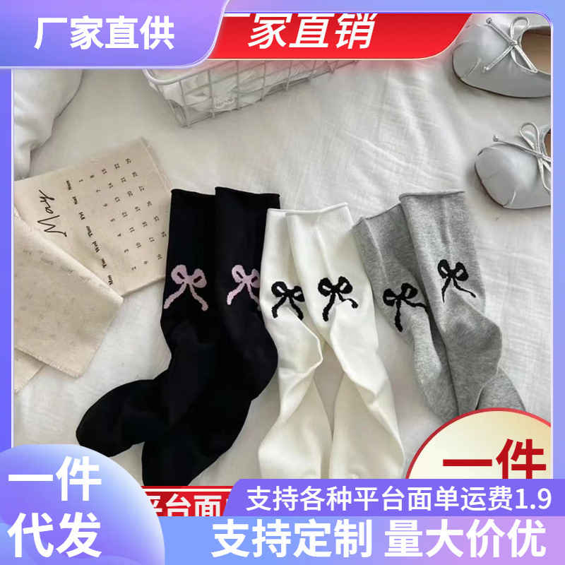 女性用靴下 和風 シンプル 白黒 グレー リボン 優しい女の子 イン 万能 かわいい バレエ風 ミッドチューブ