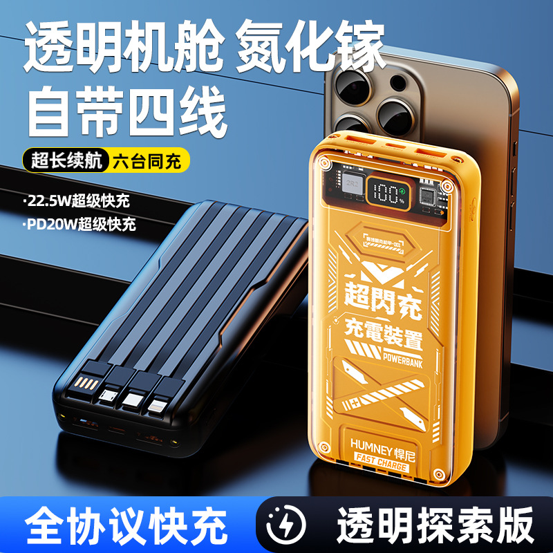 20000mAh透明窒化ガリウム製モバイルバッテリー、4線式充電ポート搭載、ポータブル窒化ガリウム製充電器