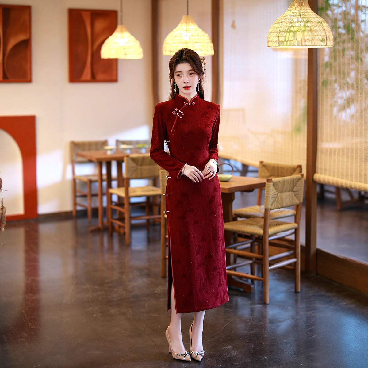 烫金丝绒国风新中式长款春季长袖旗袍改良年轻款女复古晚礼服春秋