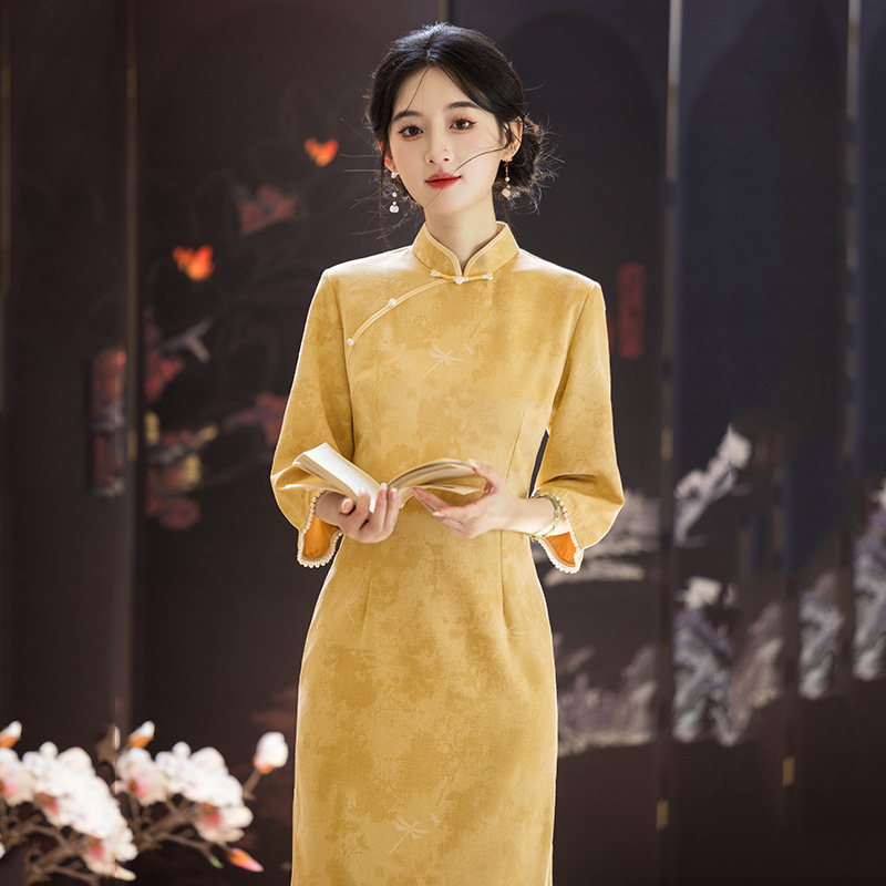 黄色国风新中式长款秋季长袖旗袍改良年轻款女高级感复古修身春秋