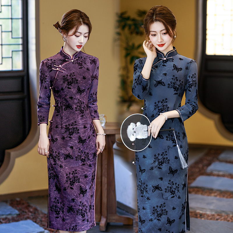 刺繍入りブルーベルベット中国風新中式秋長袖改良旗袍女性用高級感レトロファッションショー風春秋