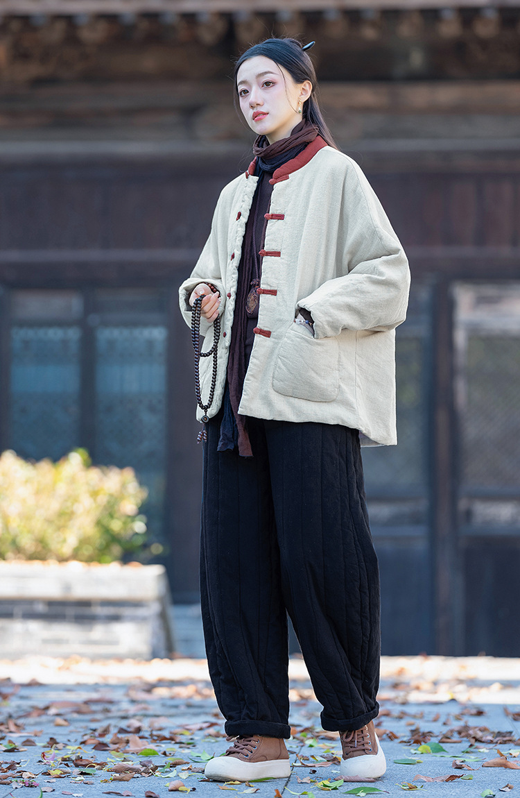 2025 冬の新レトロ中国風スタンドカラー中国風コントラストカラーボタンミッドレングス中綿ジャケットリネンルーズバージョン中綿ジャケット