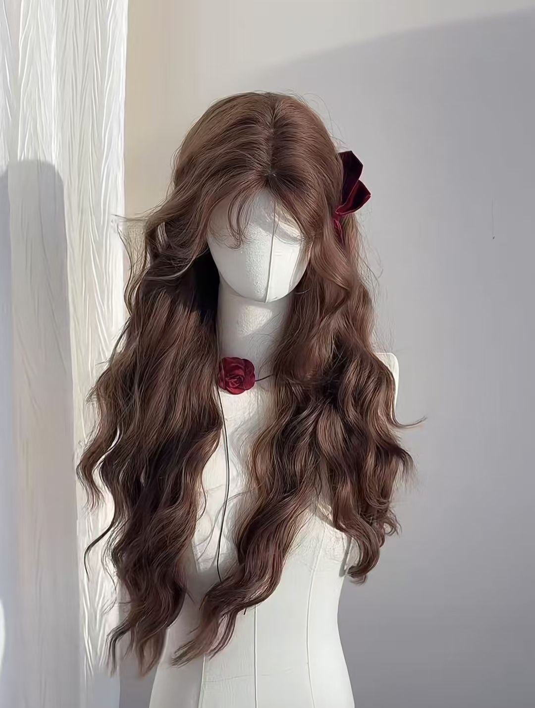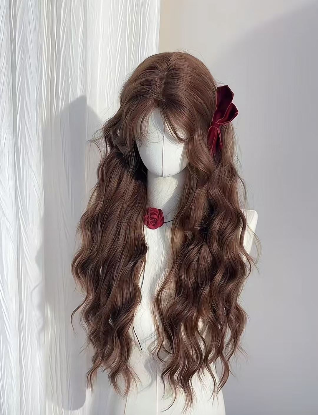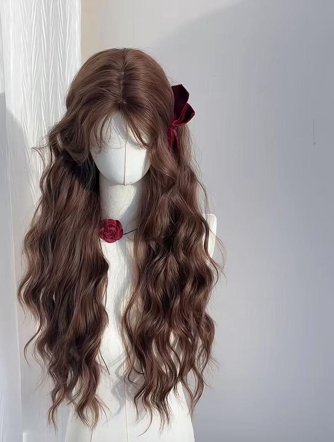 香港風ウール巻きかつら女性ロングヘア栗茶色中分怠惰長巻き髪自然シミュレーション人髪全頭カバー式
