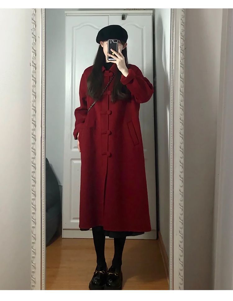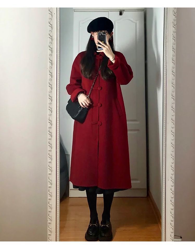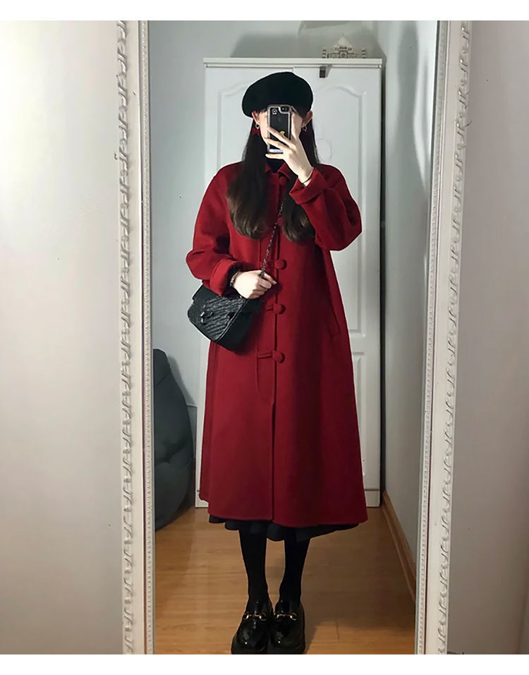 両面ウールコート 2025 秋冬新作レッド中国風ロングレトロウェディングウールジャケット