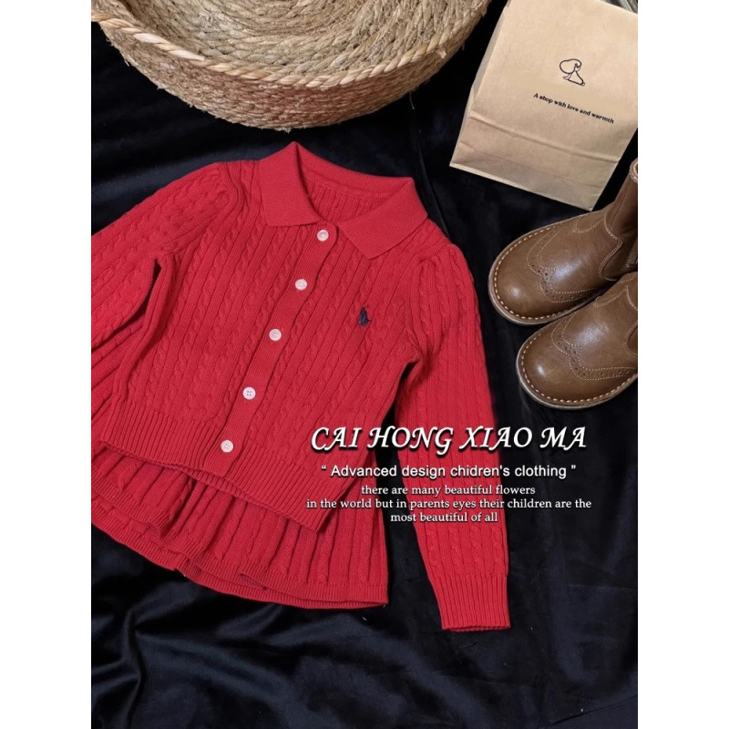 韓国版の女の子2025春の新型純綿の花の麻の花のニットのカーディガンの新年の赤い洋風のスカートのスーツ