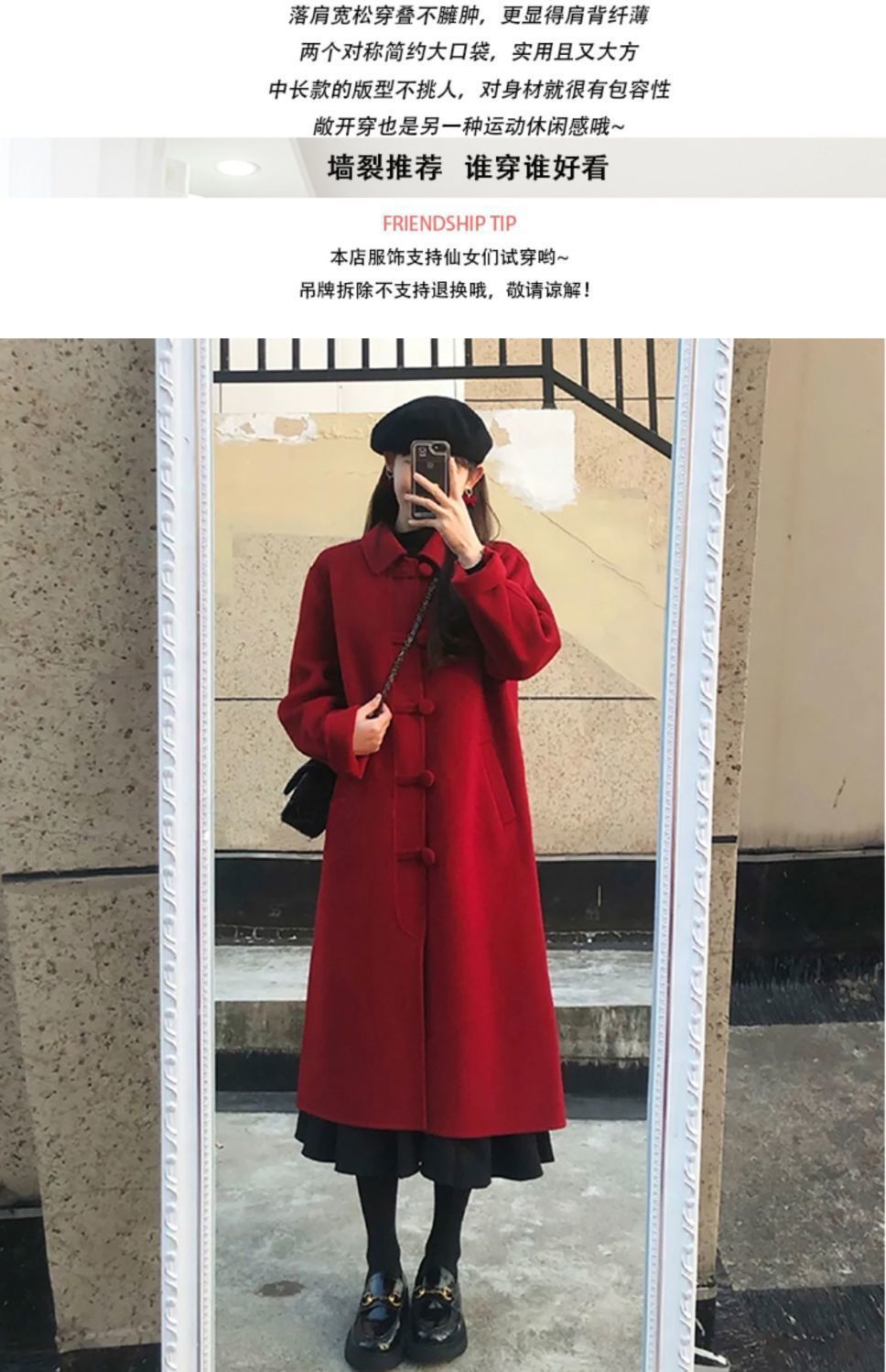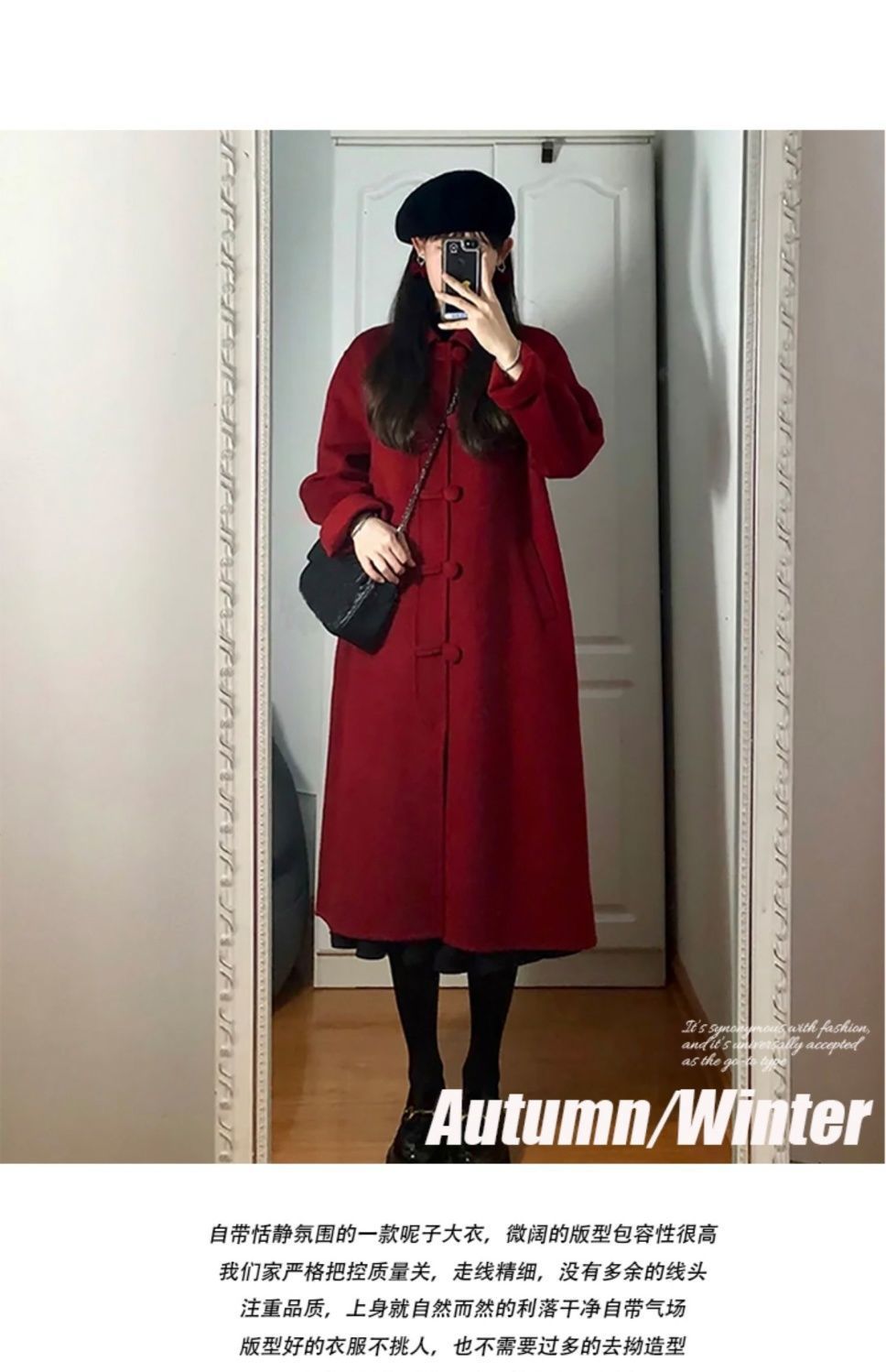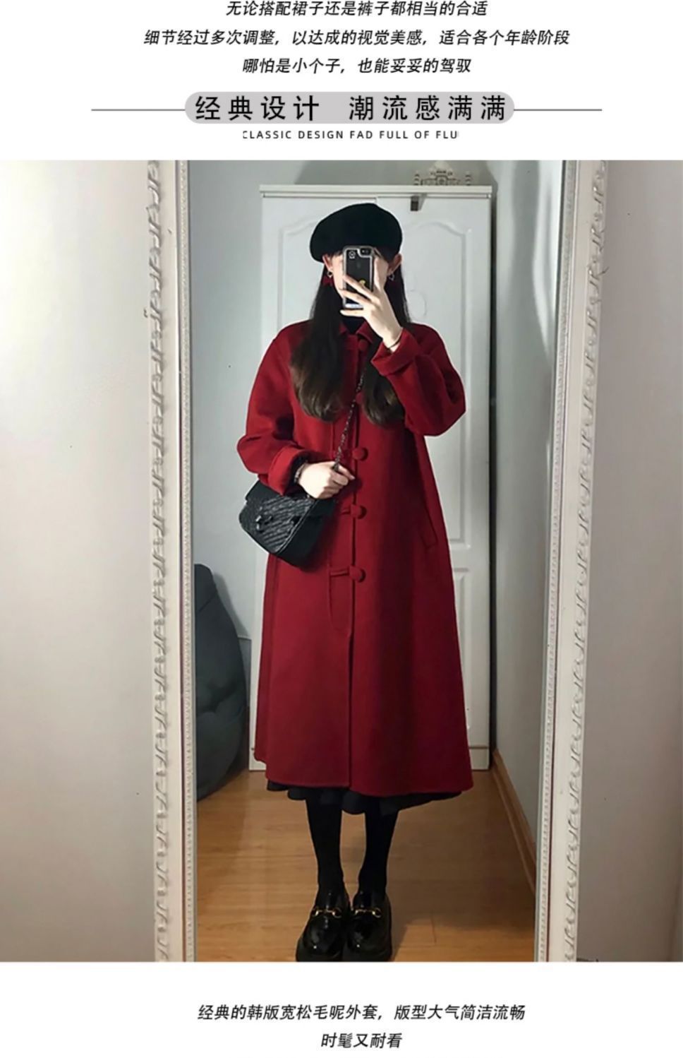 赤い綿の毛を入れていますね。コートの女性2024秋冬服の高級新年のヘップバーン風ラシャの中の長さの厚いコートです。