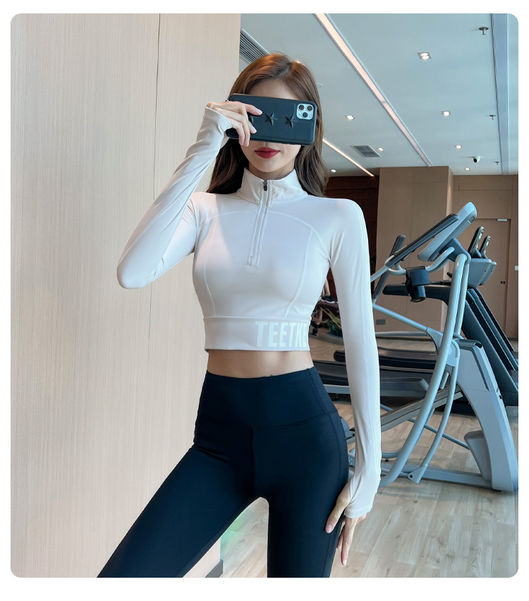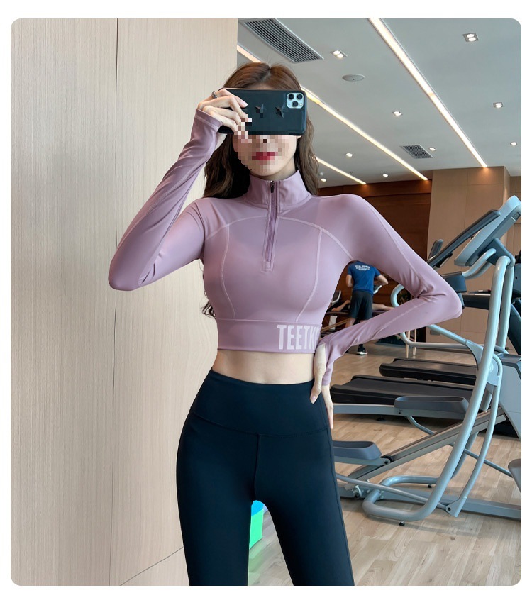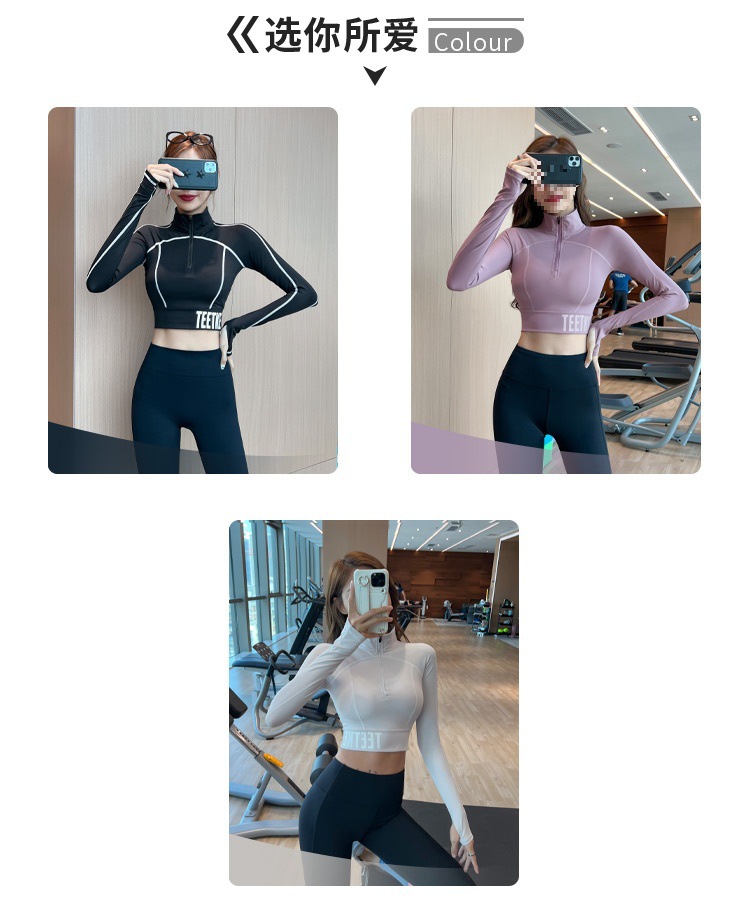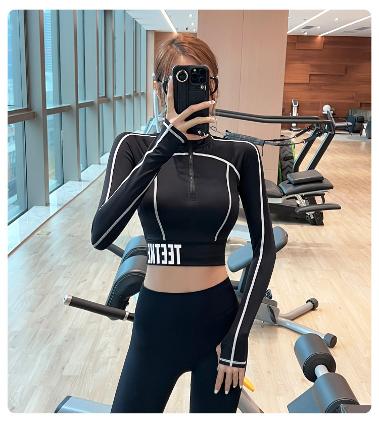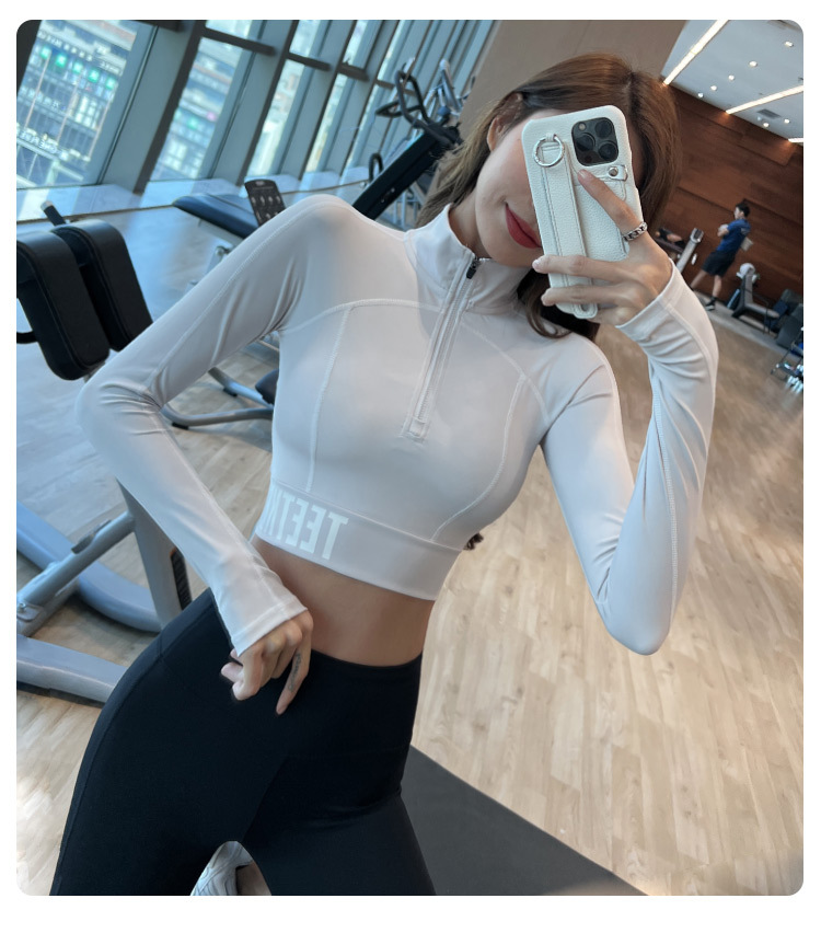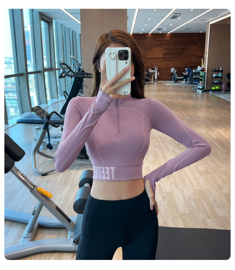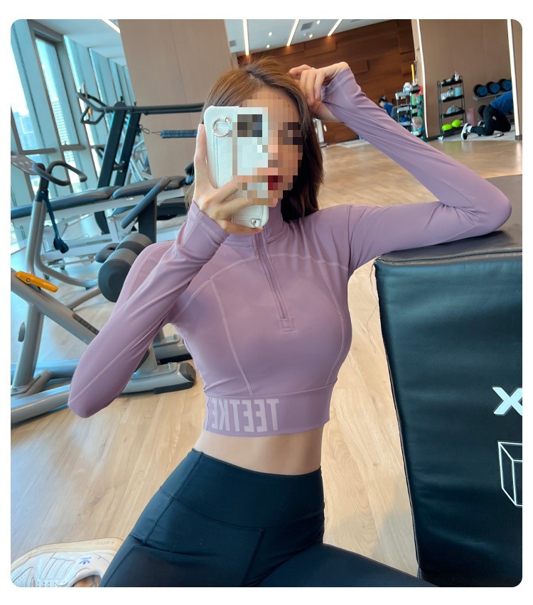 フィットネスの女の子がハンサムで痩せているヨガ服のガードルの短い運動長袖の半ファスナーの機関車のランニングネットの赤い上着