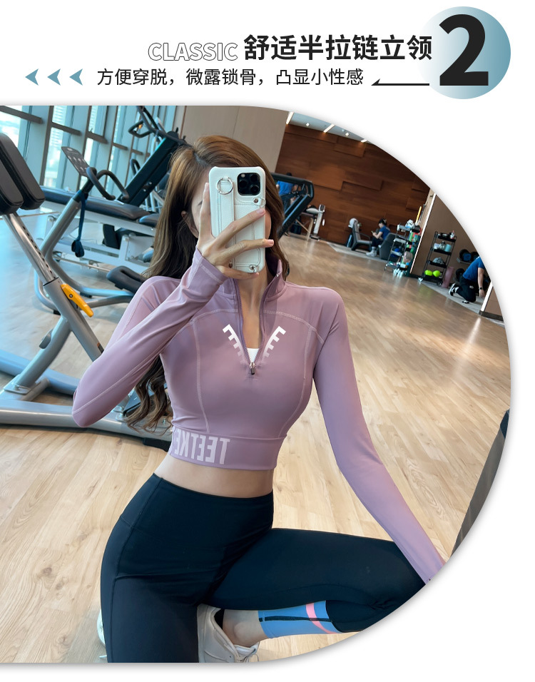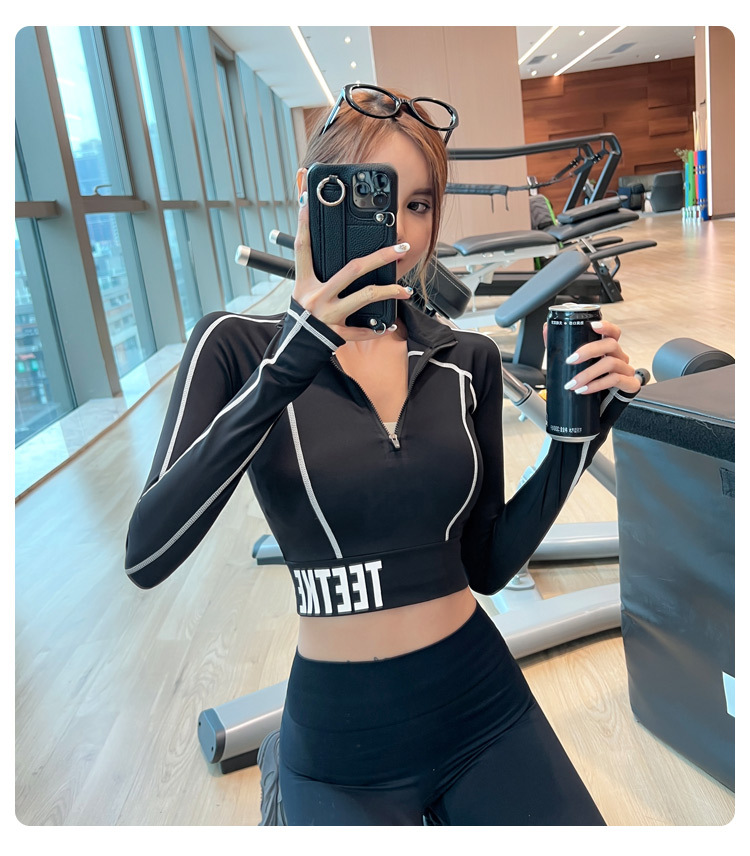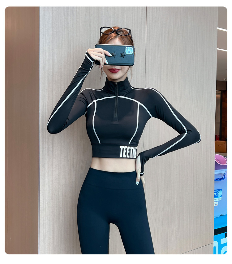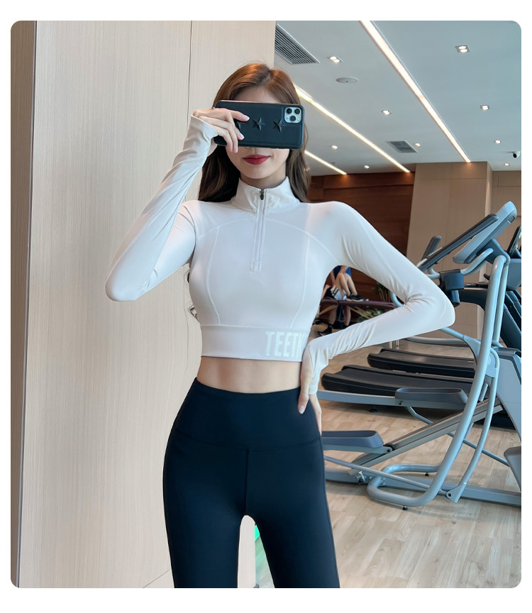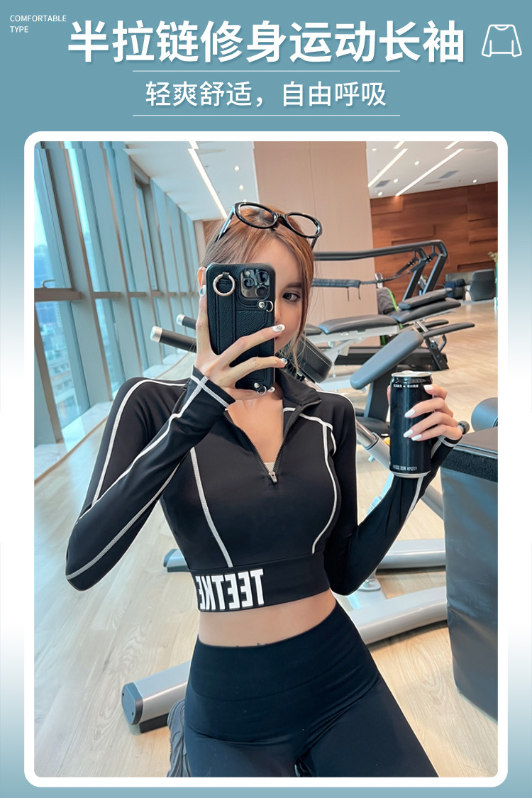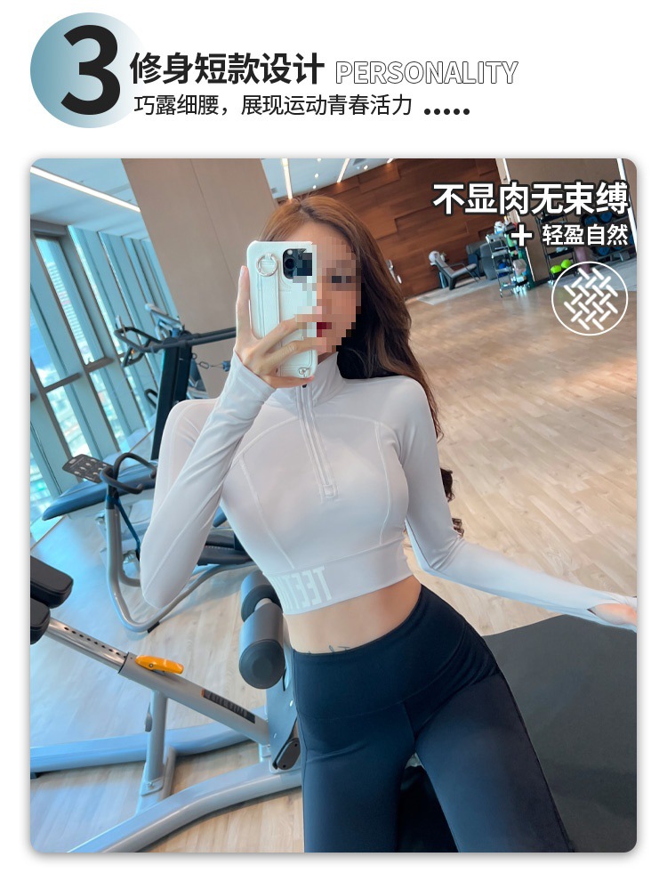 フィットネスの女の子がハンサムで痩せているヨガ服のガードルの短い運動長袖の半ファスナーの機関車のランニングネットの赤い上着