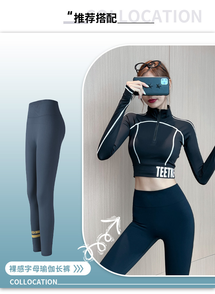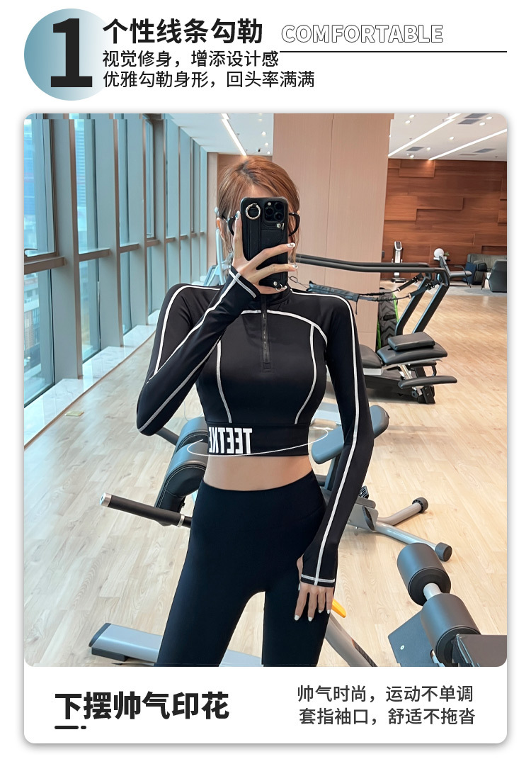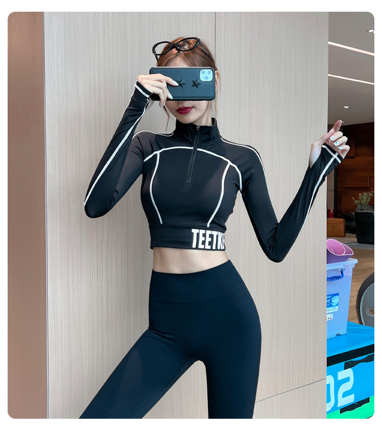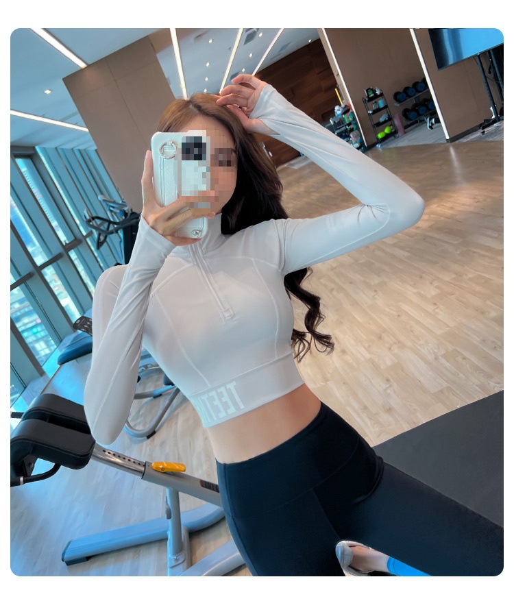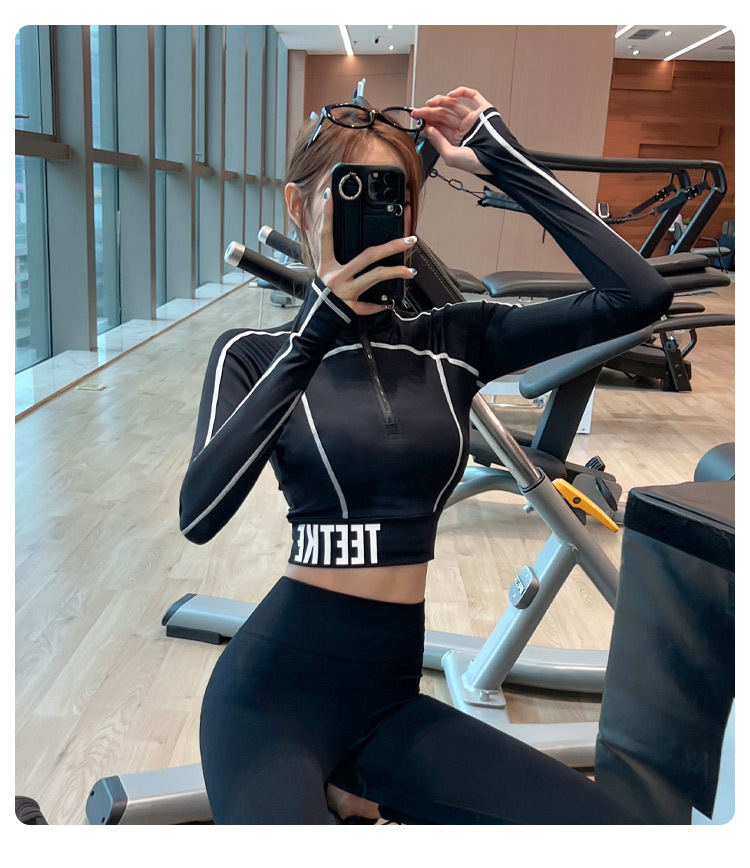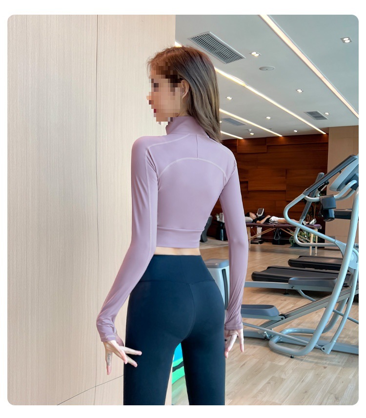 フィットネスの女の子がハンサムで痩せているヨガ服のガードルの短い運動長袖の半ファスナーの機関車のランニングネットの赤い上着