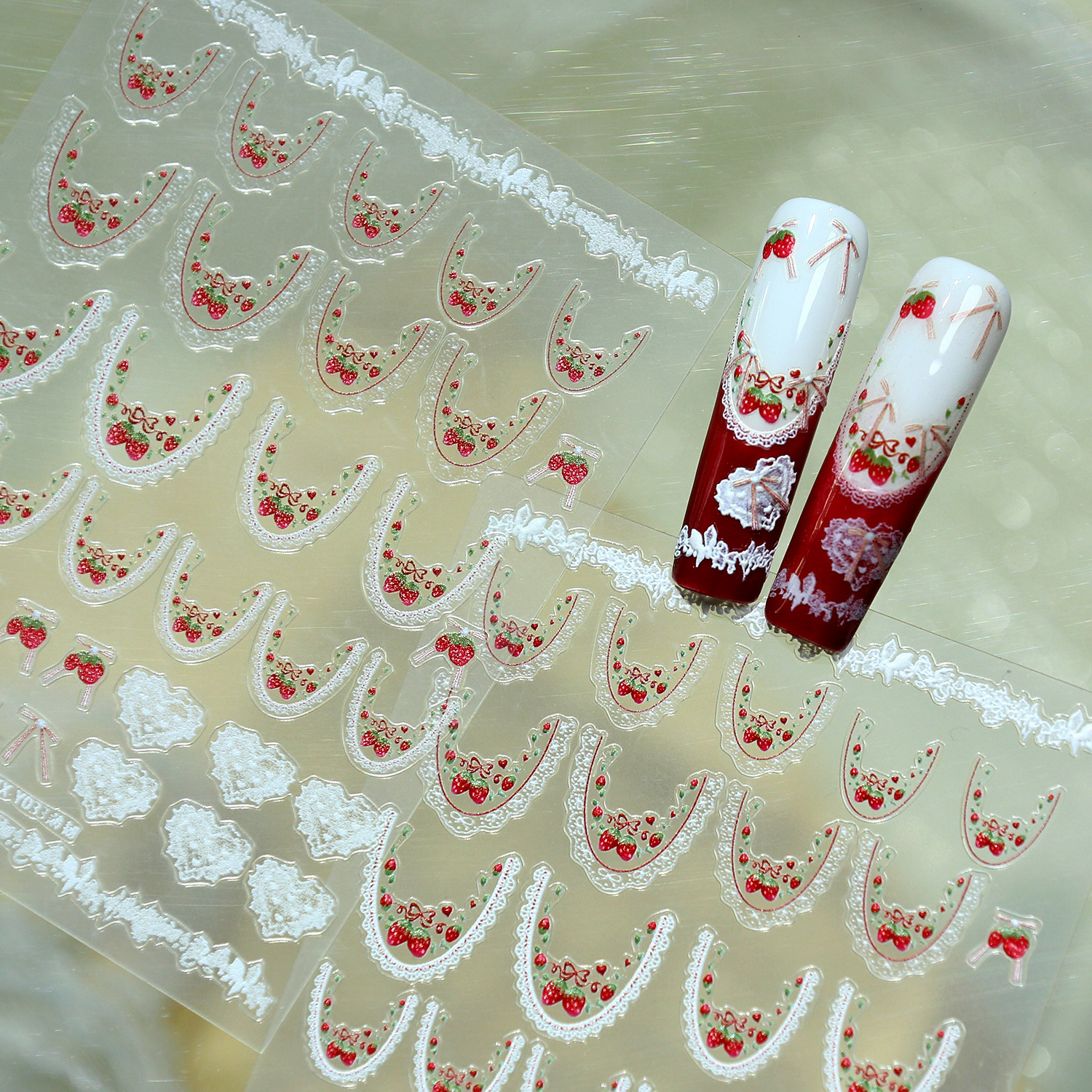 原创网红爆款草莓蕾丝边法式蝴蝶结爱心薄韧浮雕纯欲少女美甲贴纸