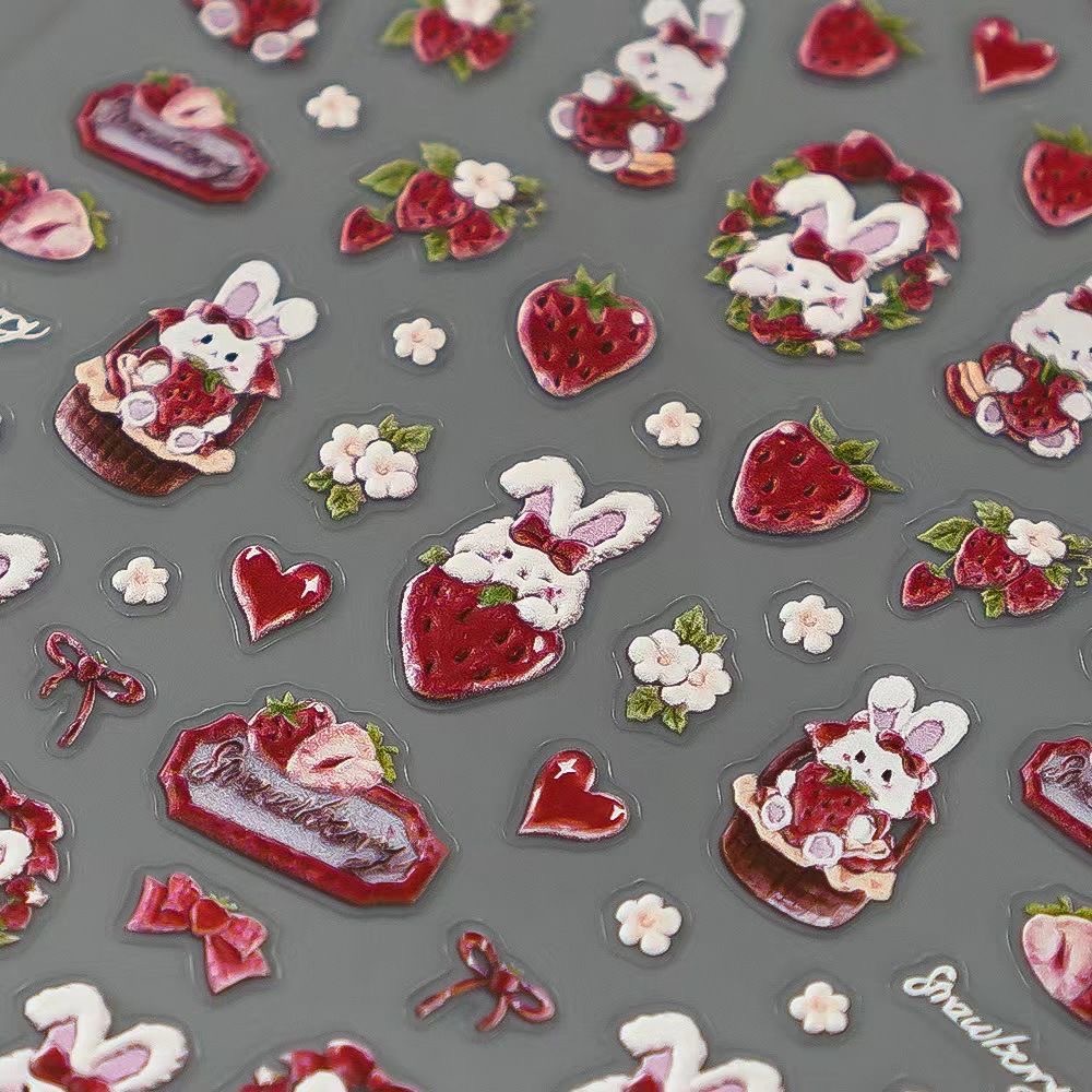 いちごうさぎ立体レリーフ大耳小白うさぎネイルシール手帳diyシール花籠ネイルステッカー