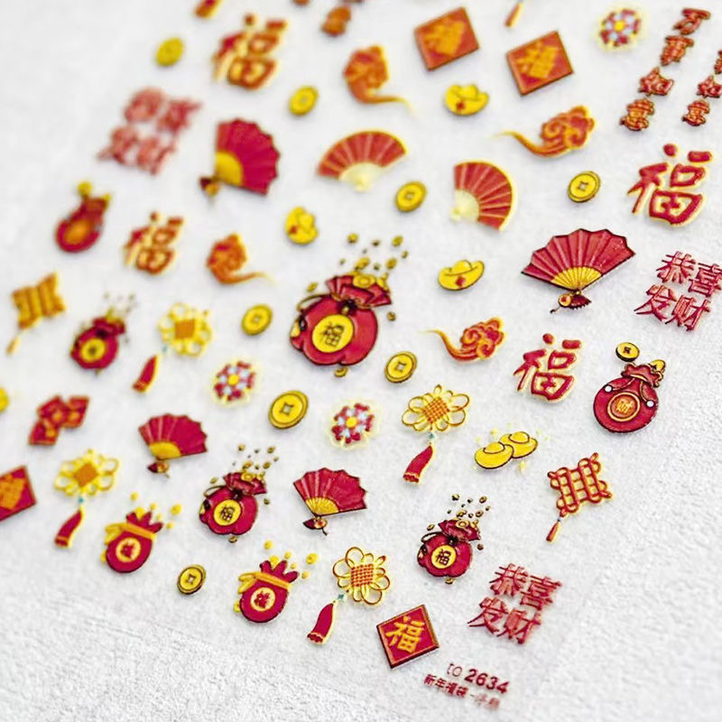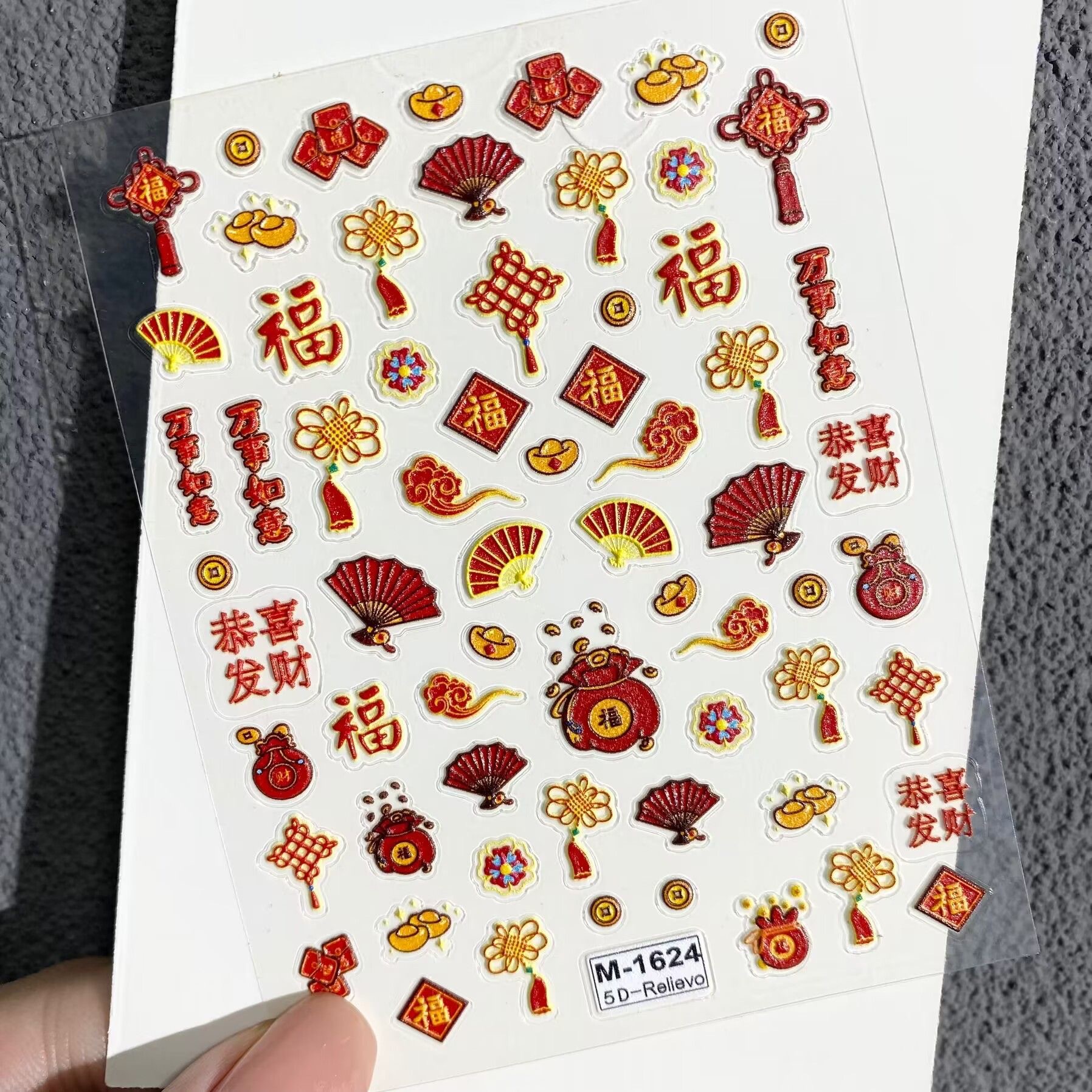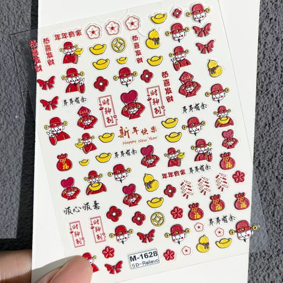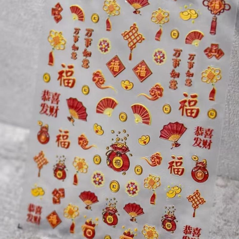 新春美甲贴纸新年暴富发财福字锦鲤国风装饰立体浮雕卡通指甲贴纸