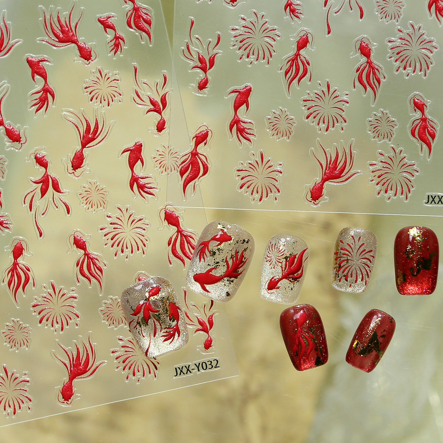 原创5D立体浮雕新年红色锦鲤美甲贴纸中国风爆闪可爱款背胶装饰贴