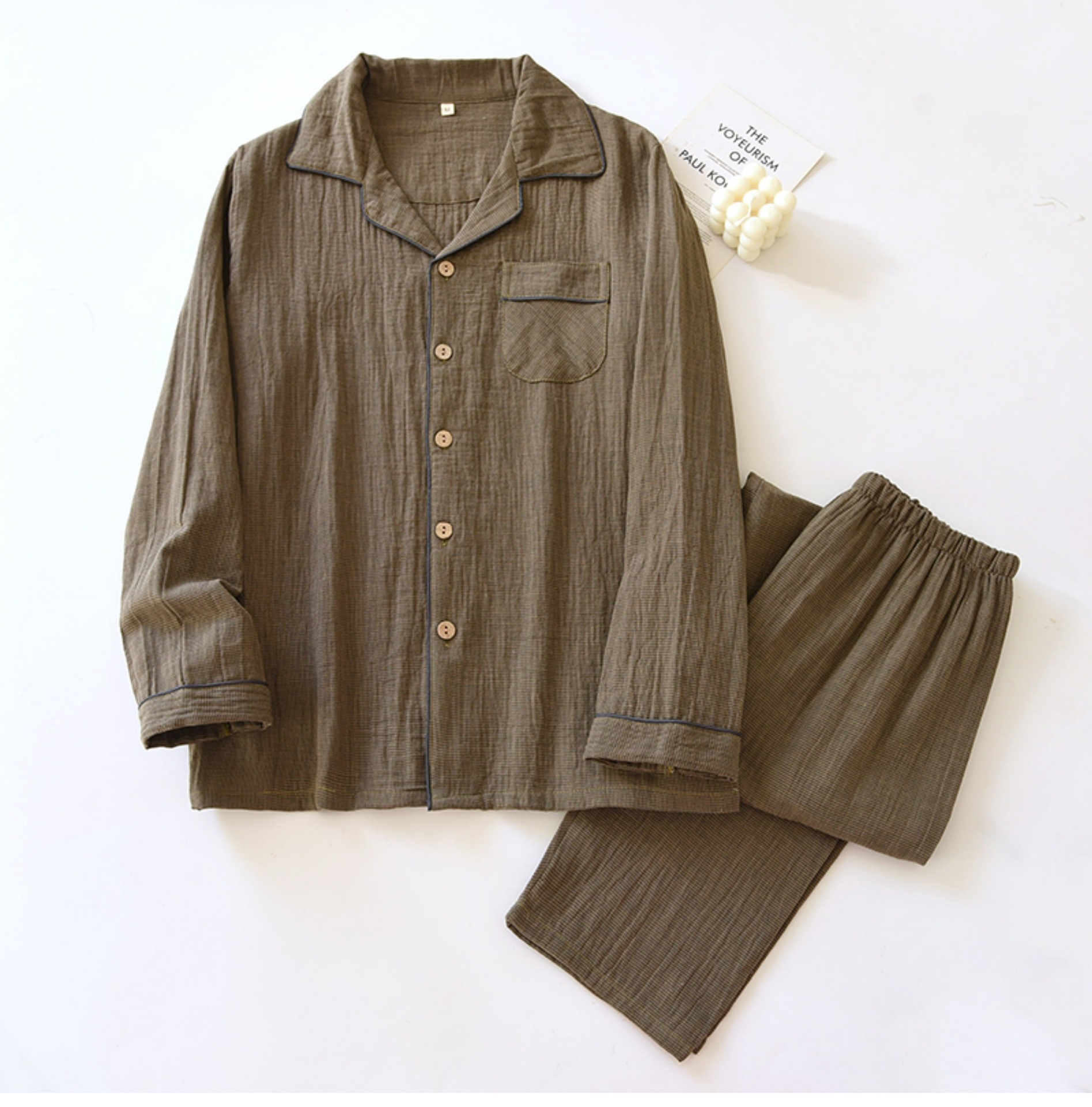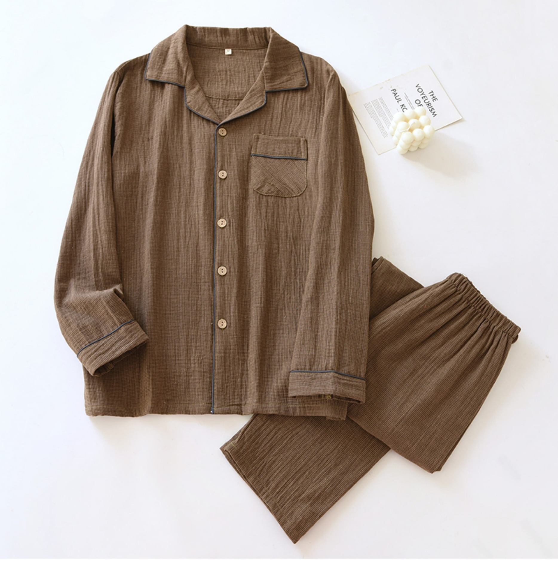 新款男士纯棉双层纱长袖长裤套装家居服睡衣宽松大码薄款休闲简约