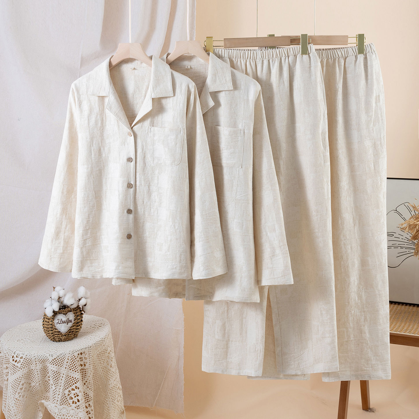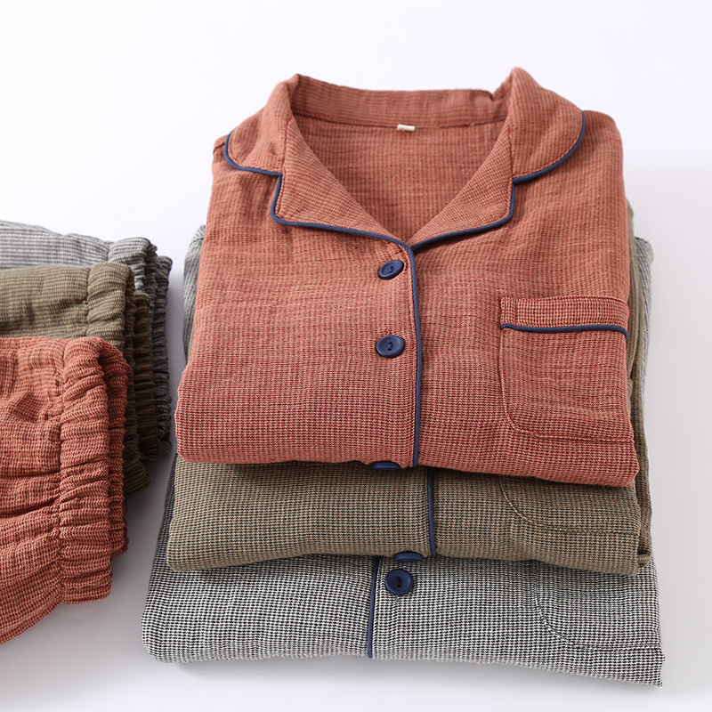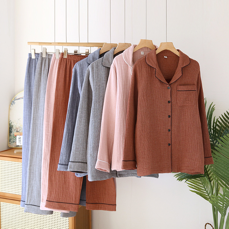 日系無印純綿ガーゼカップルパジャマ四季薄手長袖長ズボン折り襟男性女性シンプルホームウェア