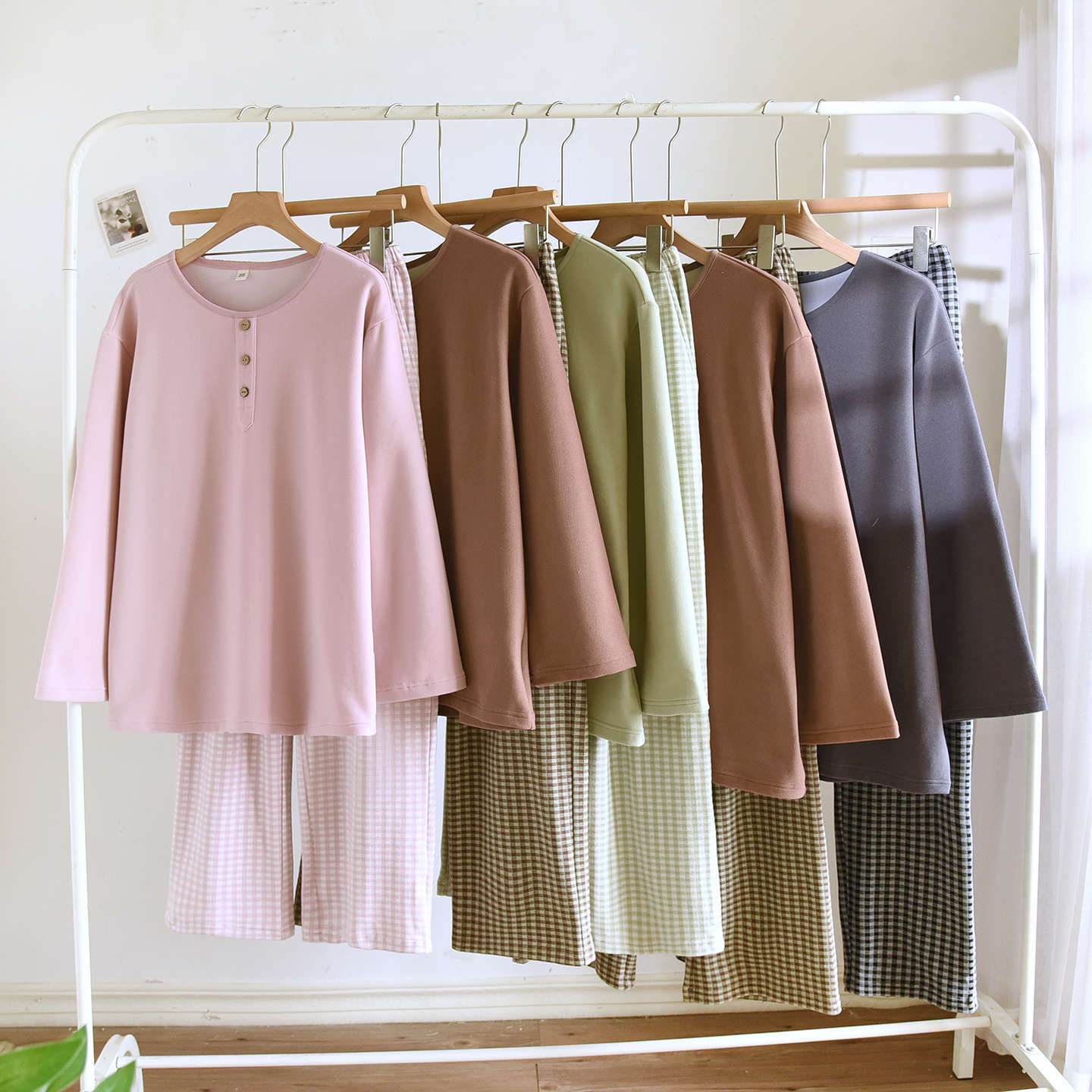 日系情侣德绒睡衣秋冬季保暖套头长袖家居服套装格子男女宽松加绒