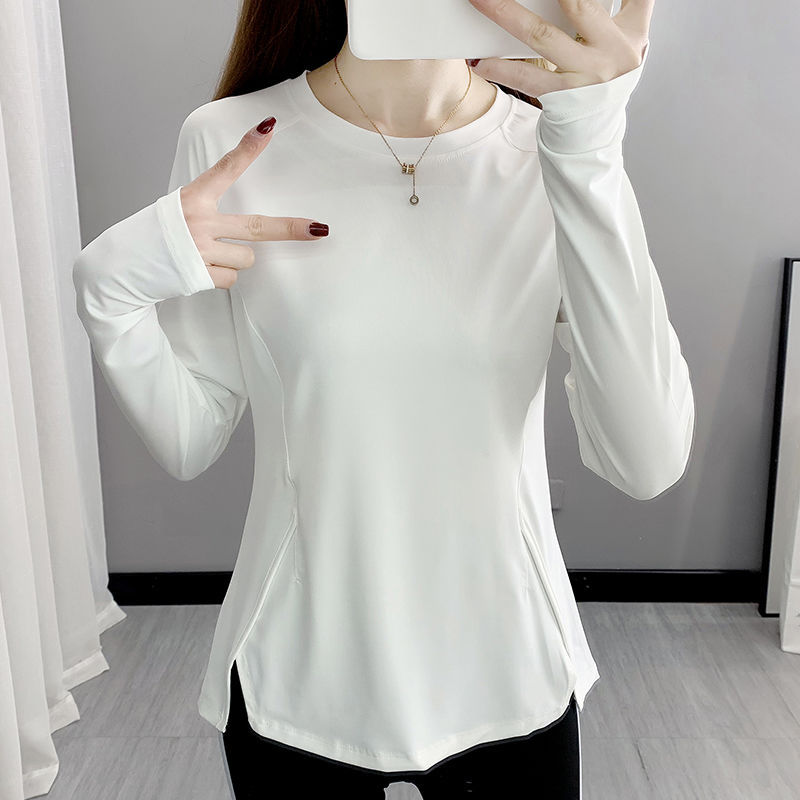 大きいサイズの丸首の速乾の服の長袖のtシャツの女性の春秋の弾力性の通気性は汗を吸います。