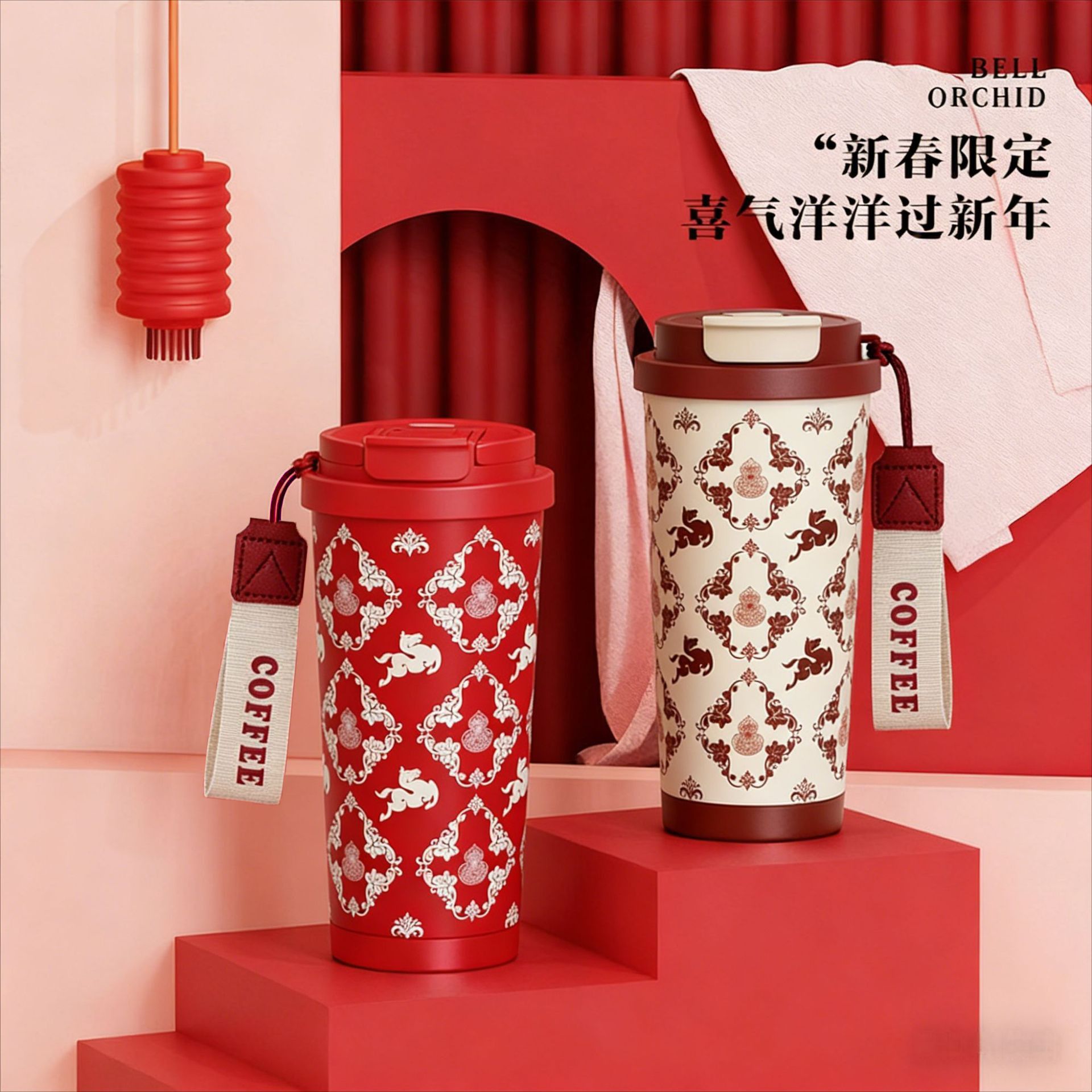 新款马年高颜值红色保温杯女咖啡杯高级吸管杯子轻奢大容量水杯