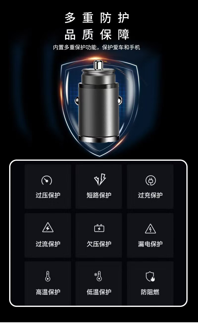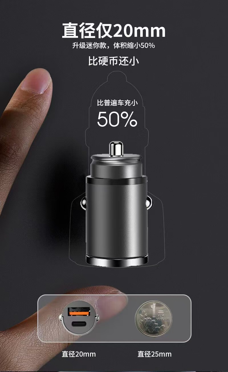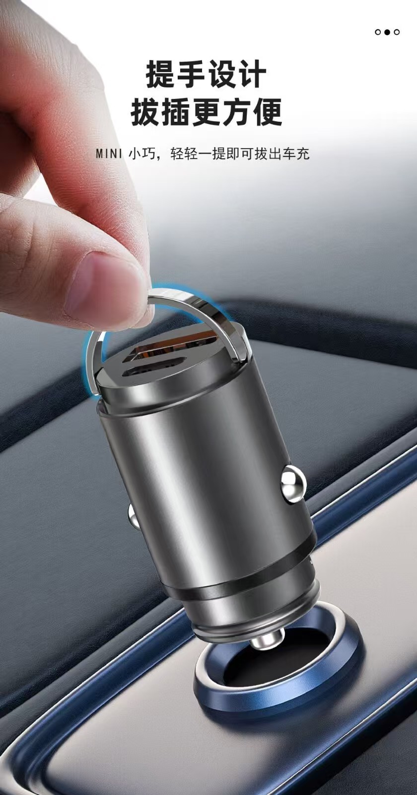 新型超急速充電合金製車載充電器 隠蔽型QC3.0車載充電器 PD 30Wミニ車載充電器 3A車載充電器