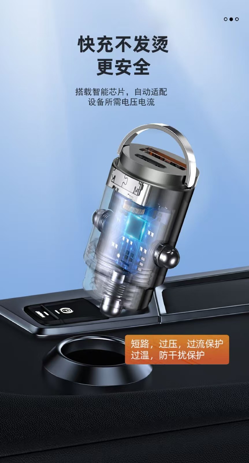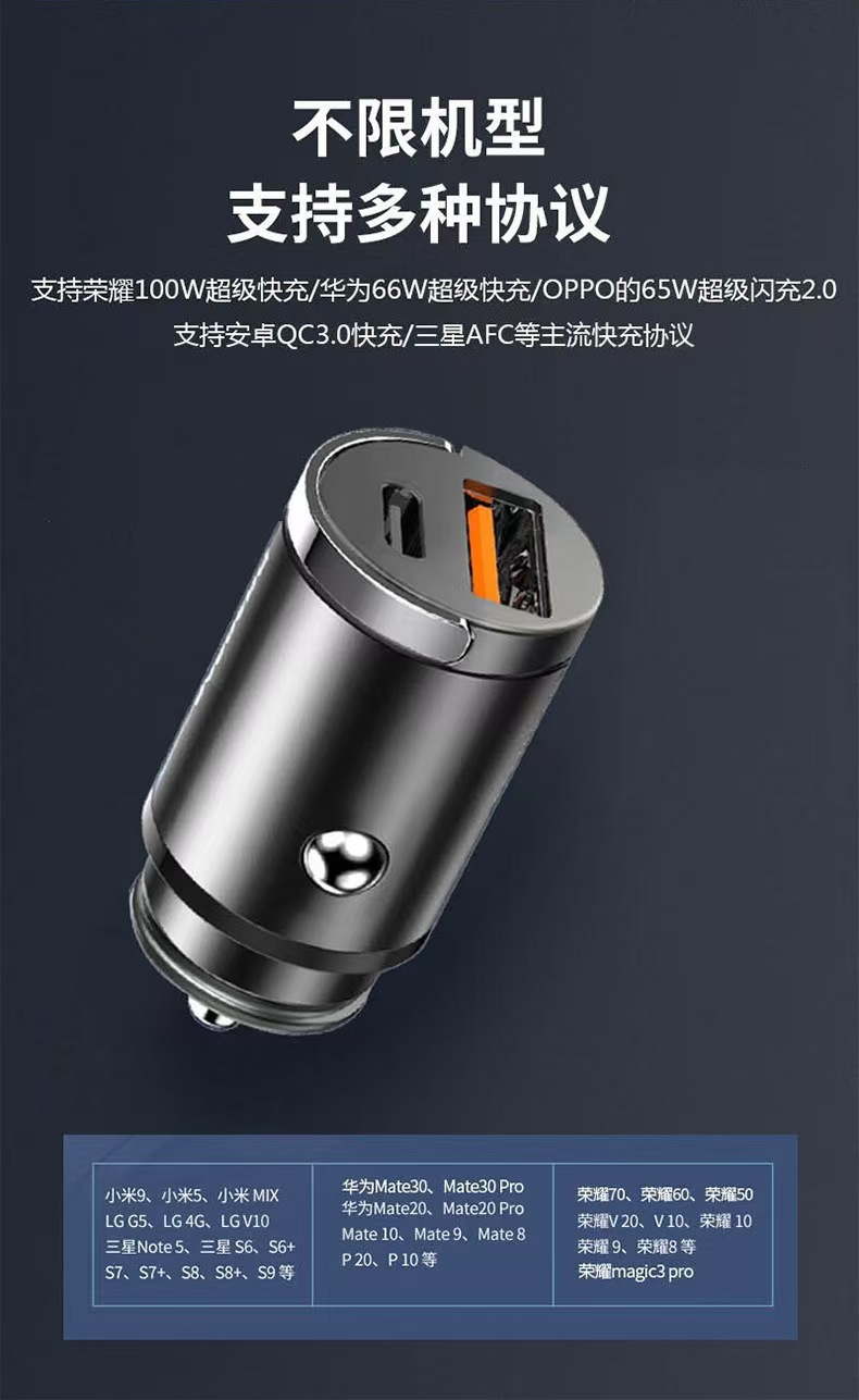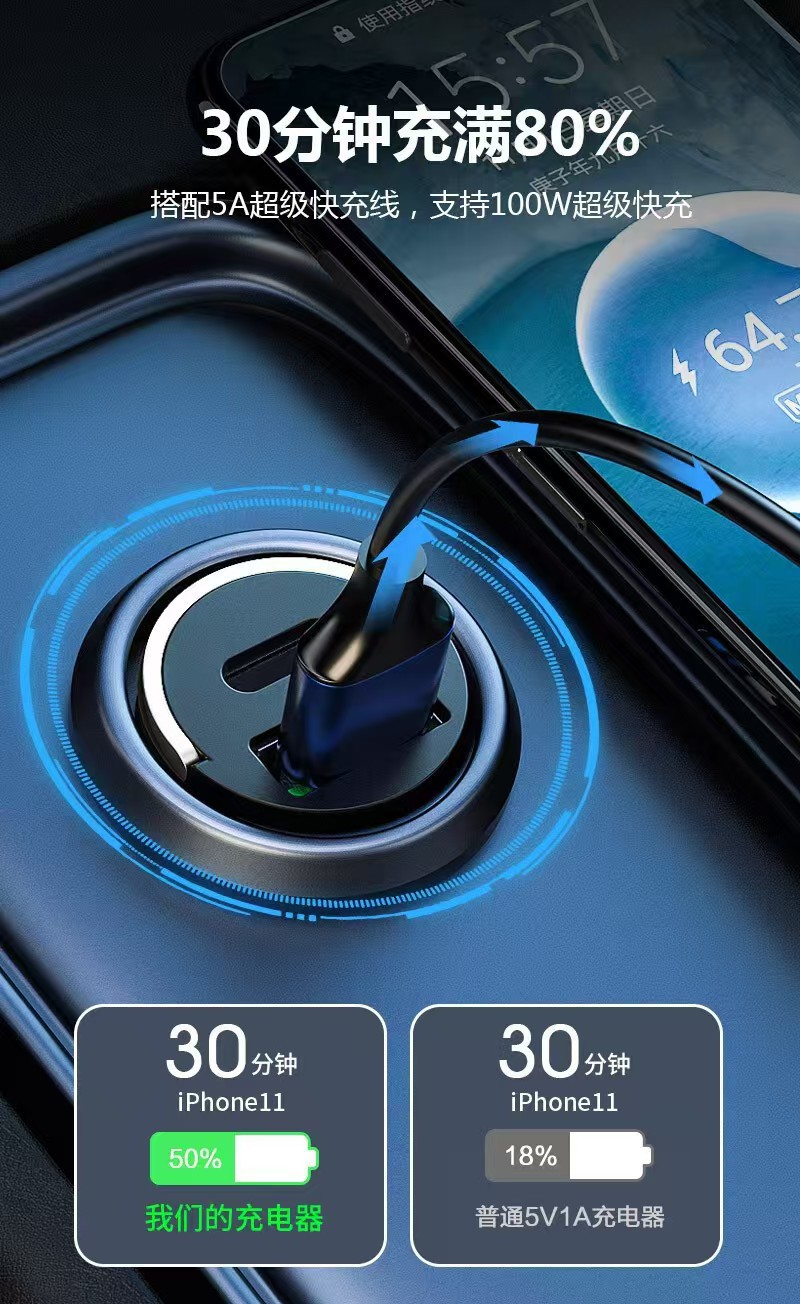 迷你隐藏款超级快充华为苹果PD一拖二汽车100W超级快充车载充电器