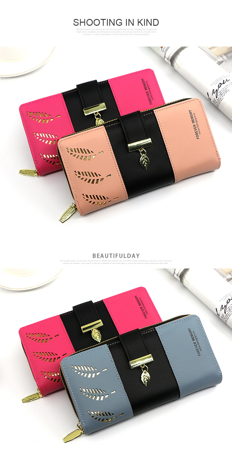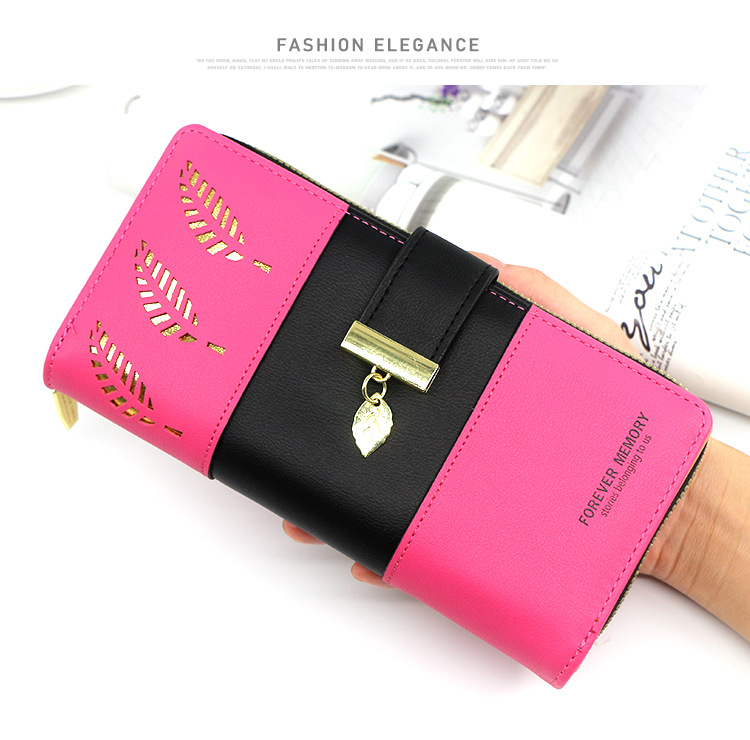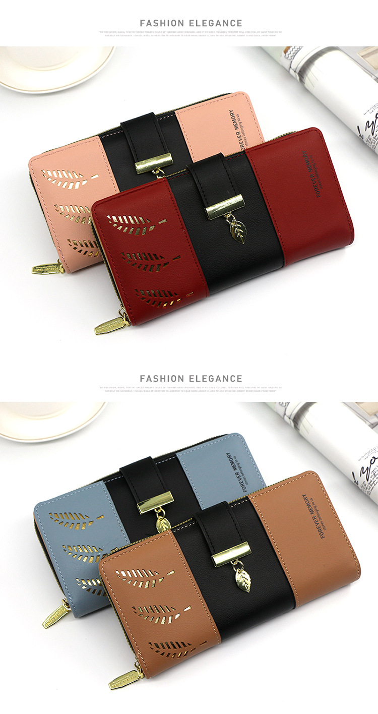 韩版拼接色新款长款二折镂空叶子钱包女士钱夹手拿包长款手机包