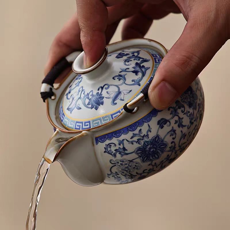 青と白のフリントレッド如意トラベルティーセットセラミック1ポット3カップポータブルクイックカップ屋外車旅行