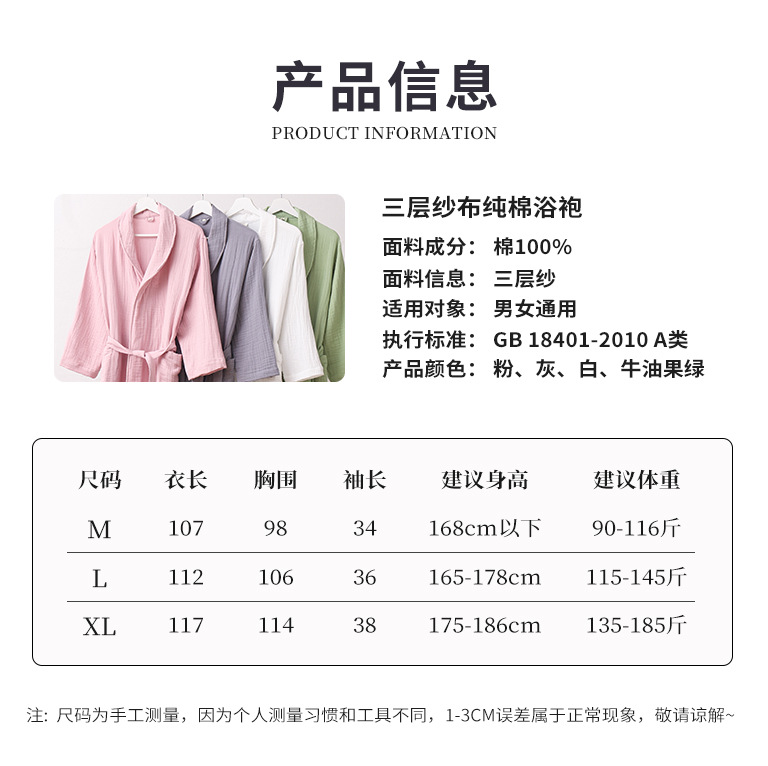 純綿四季A類三層ガーゼ浴衣寝衣ホームウェア吸水肌柔らかいカップル美容院