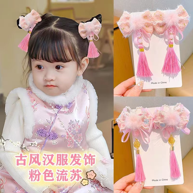 漢服の頭飾りの女の子のピンク系の蝶結びのリボン