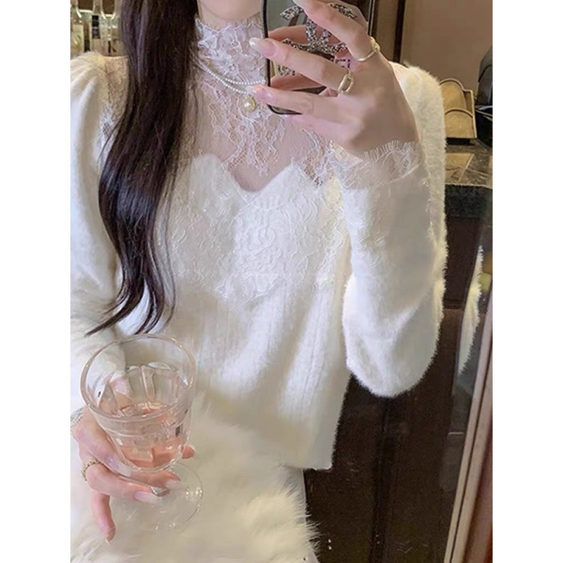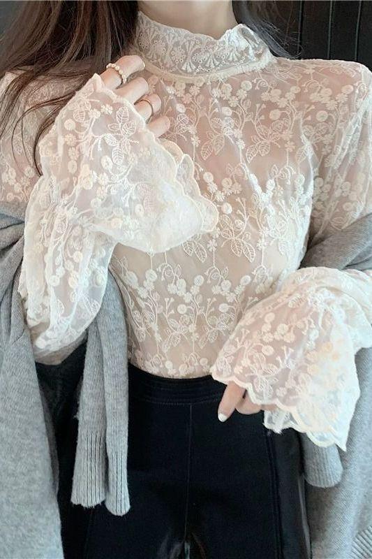 蕾丝打底衫女立领领秋秋毛衣内搭洋气网纱喇叭袖上衣长袖蕾丝衫