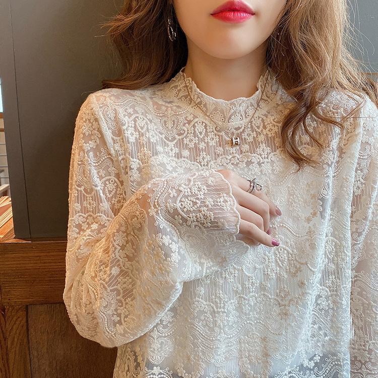 2228薄手/ベルベットの半高襟の長袖レースシャツの女性秋冬の新しい気質の中にシャツを着ている