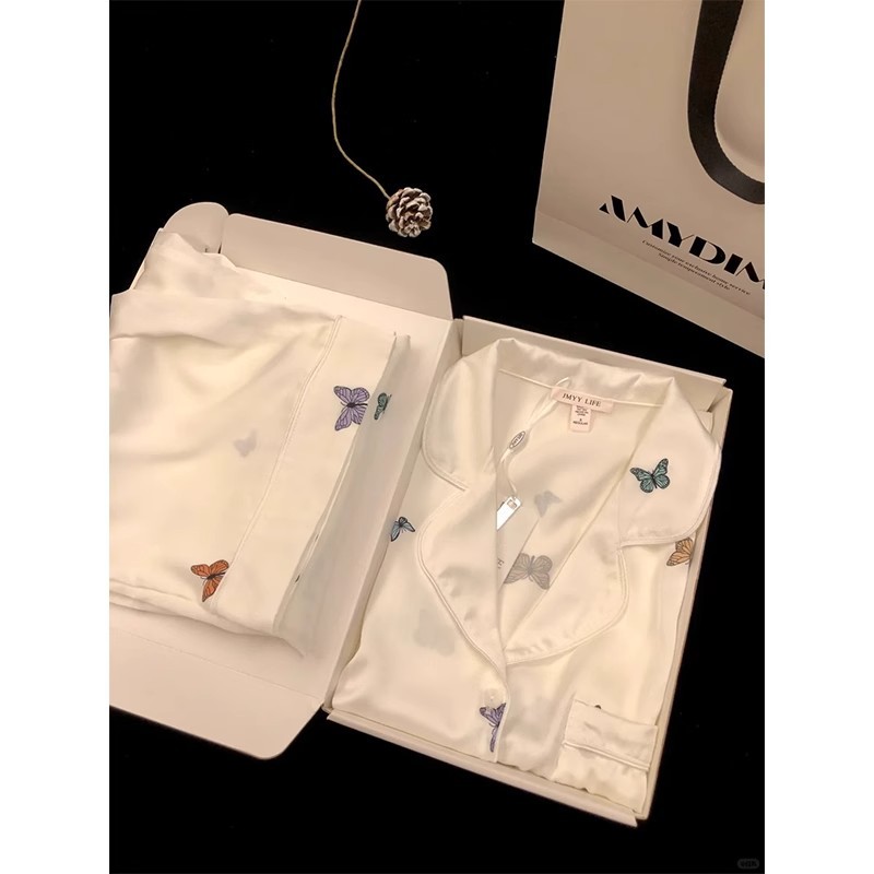 国境を越えたパジャマ女性春秋タイプの氷糸長袖高セット級感シルクの家庭服は夏にゆったりと着ることができる