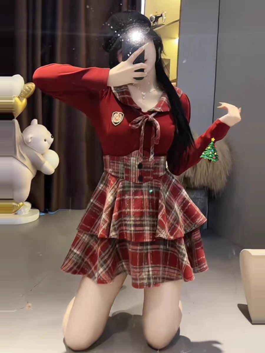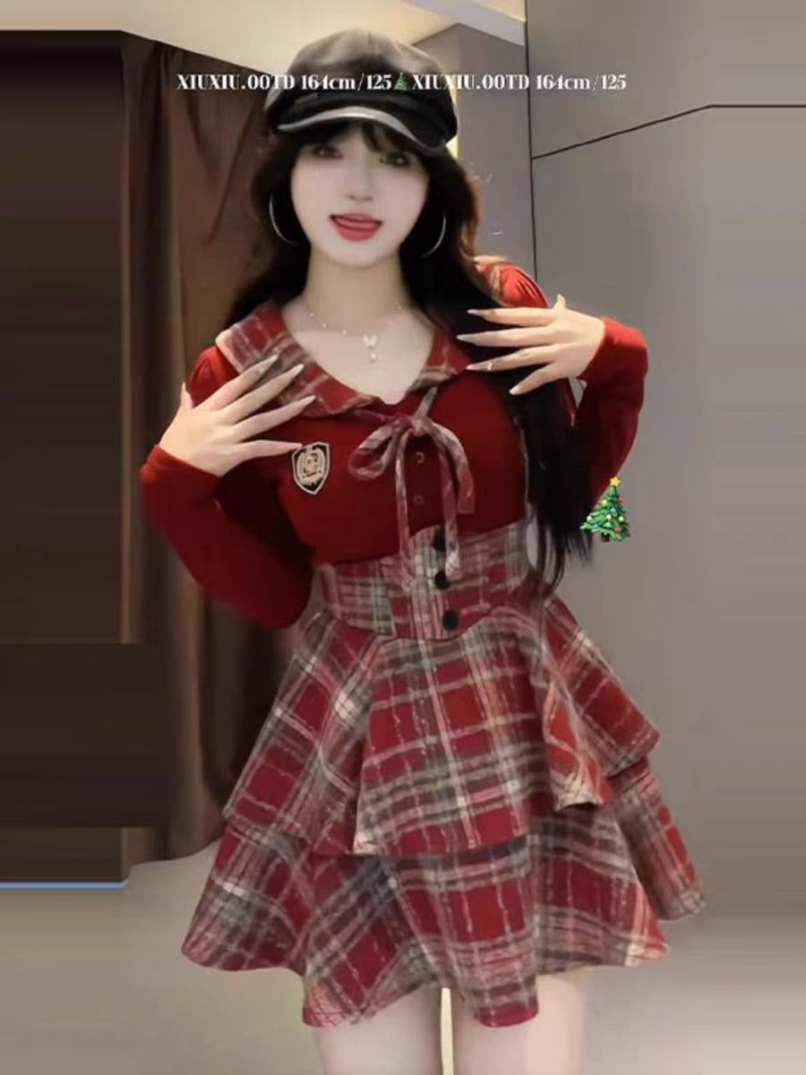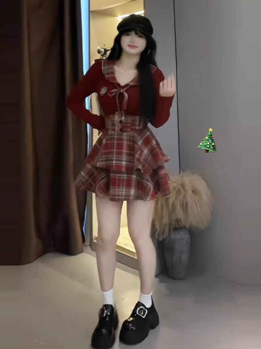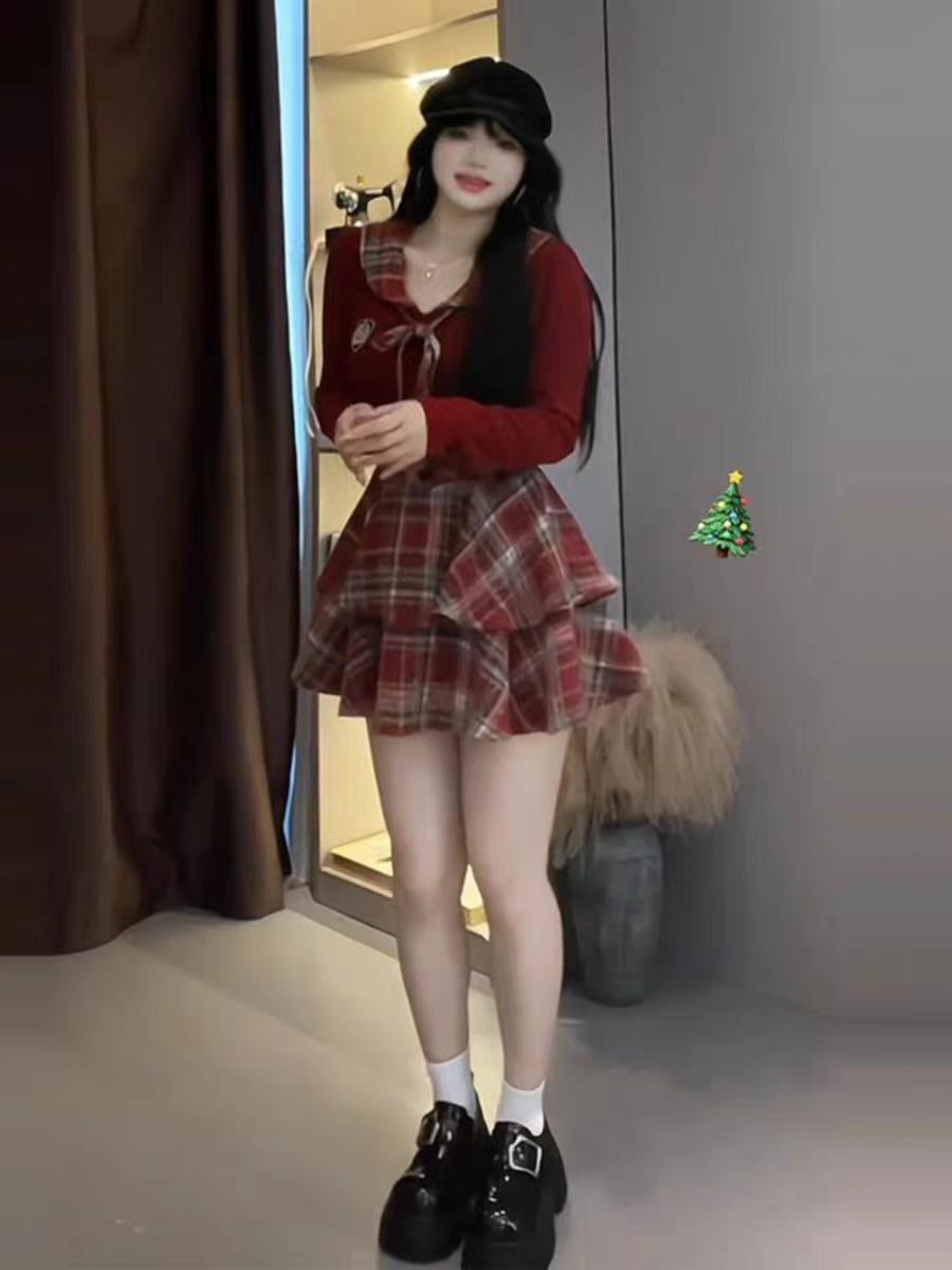 黒トップス+赤毛チェックスカート【2点セット】,バーガンディトップス+ウールレッドチェック柄スカート【2点セット】,バーガンディトップ,黒のトップ,ウールレッドチェック柄スカート