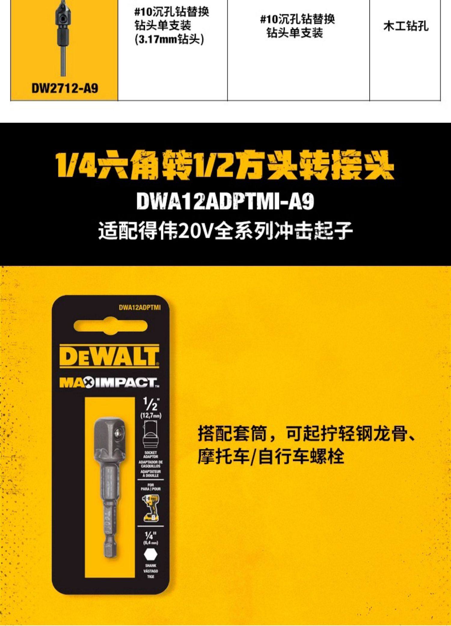 仕様とモデル インパクトドライバー適合 1/4 六角 - 3/8 スクエアヘッドアダプター DWA38ADPTMI-A9,インパクトドライバーは 1/4 六角 - 1/2 角ヘッドアダプター DWA12ADPTMI-A9 に適合します,#6皿穴ドリルビットクイックチェンジ DW2700-A9,# 8皿穴ドリルビットクイックチェンジ DW2701-A9,#10皿穴ドリルビットクイックチェンジ DW2702-A9,#皿穴交換用ドリルビット 6 個パック (2.38mm ドリルビット) DW2710-A9,#8皿穴交換用ドリルビット シングルパック(2.77mmドリルビット) DW2711-A9,#10皿穴交換用ドリルビットシングルパック(3.17mmドリルビット) DW2712-A9,六角三爪チャック(キードリル付),# 6+ # 8 クイックチェンジヘッド ドリルビット クイックチェンジセット DW2730-A9