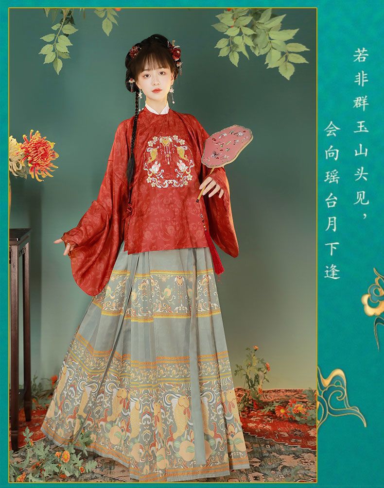 新商品のオリジナルの漢服の女性の明製のプリントのスタンドカラーのカーディガンの琵琶の袖の馬のスカートの秋冬の古風のスーツ