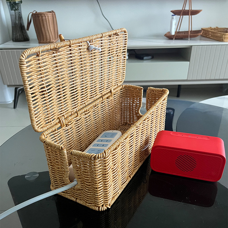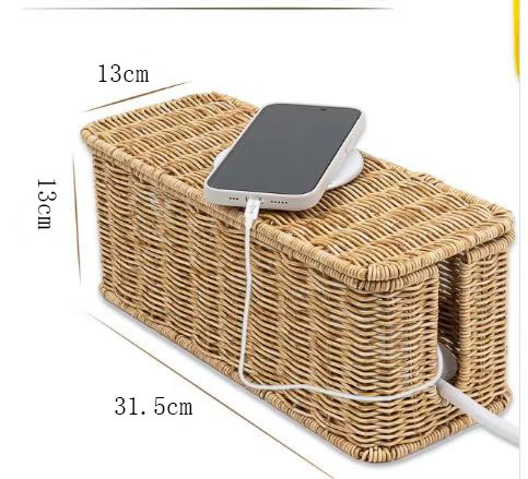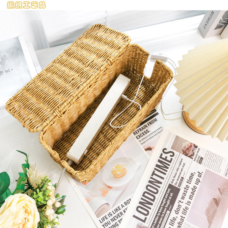 北欧田園風デスクトップコンセント整理ケース籐編寝室データライン電源コード整理収納バスケット