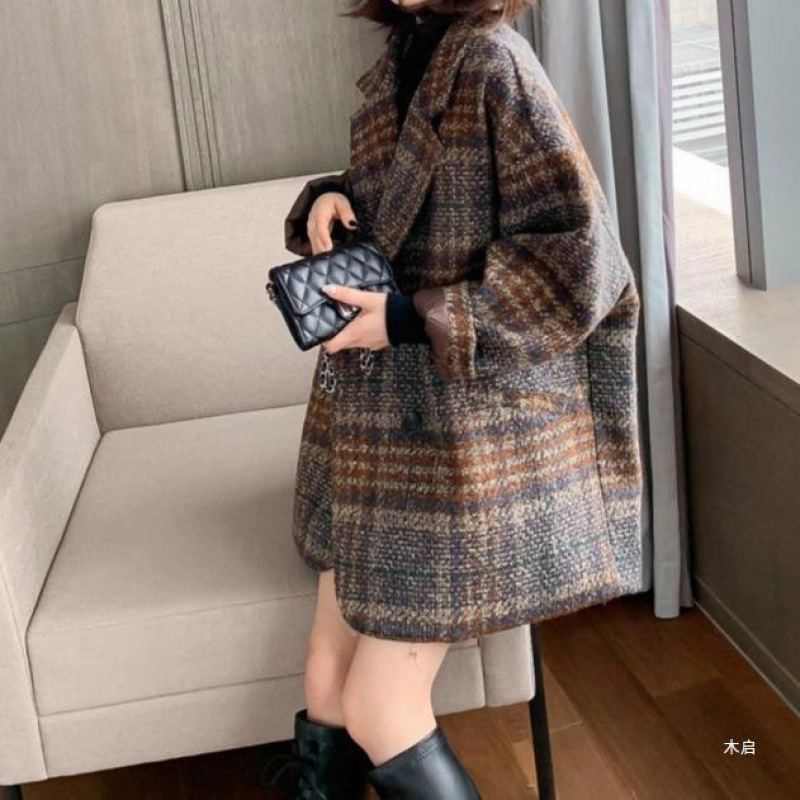 复古格子毛呢风外套女秋冬新款宽松显瘦气质西装中长款大衣潮